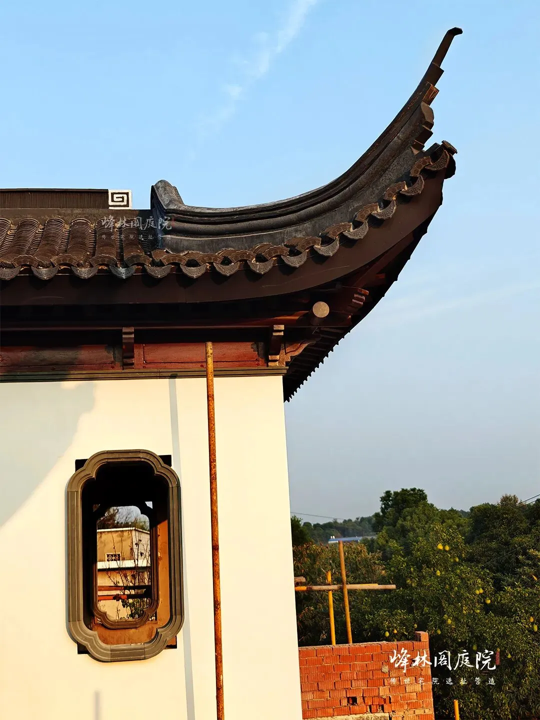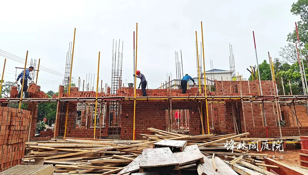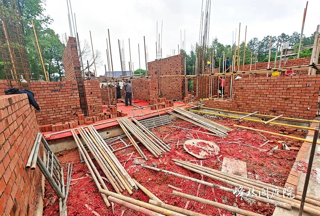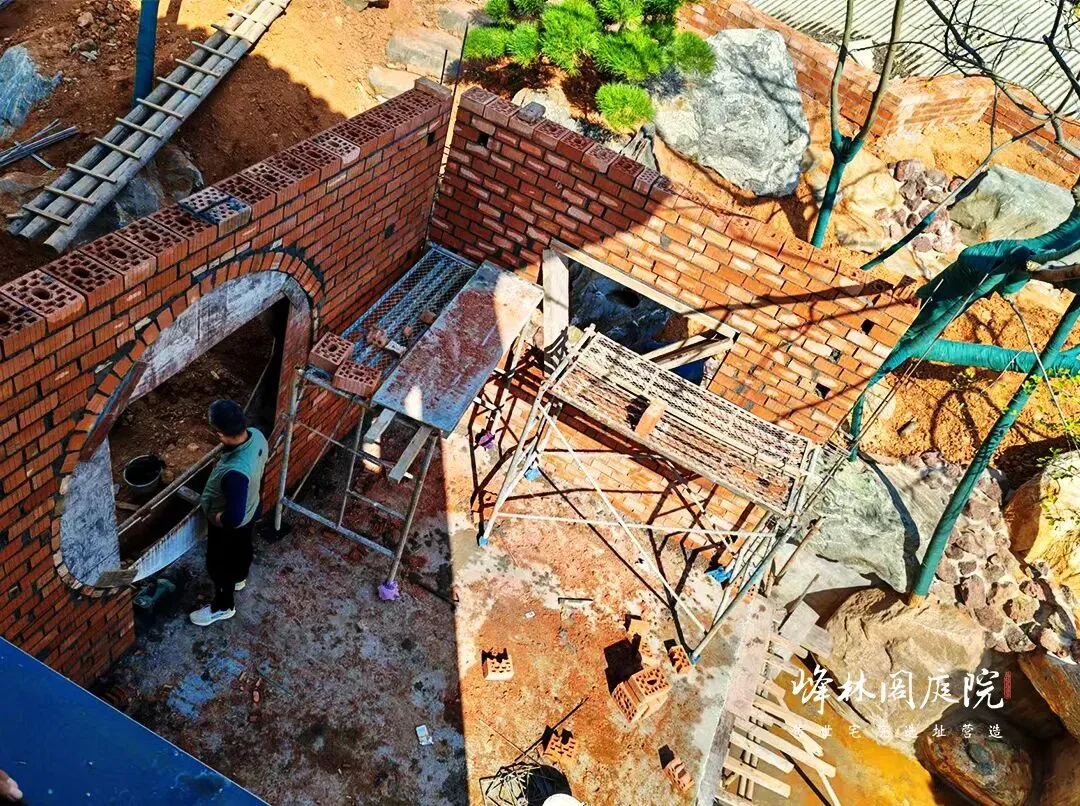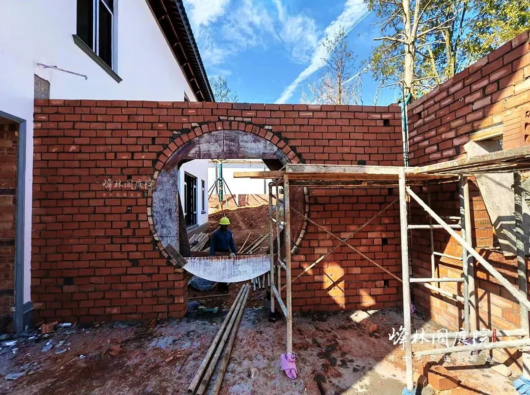 红砖在工匠手中垒起,勾勒出月洞门那圆润的雏形。脚手架环绕,工人专注于砖缝间灰浆的涂抹,每一次的勾缝都藏着对传统工艺的坚守。一旁尚未栽种的绿植区域,已预留好与月洞门呼应的景观位,未来繁花簇拥,诗意将在此处盛放。