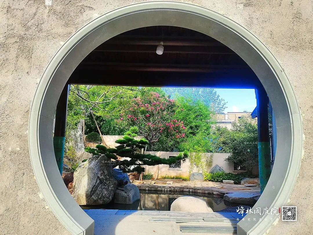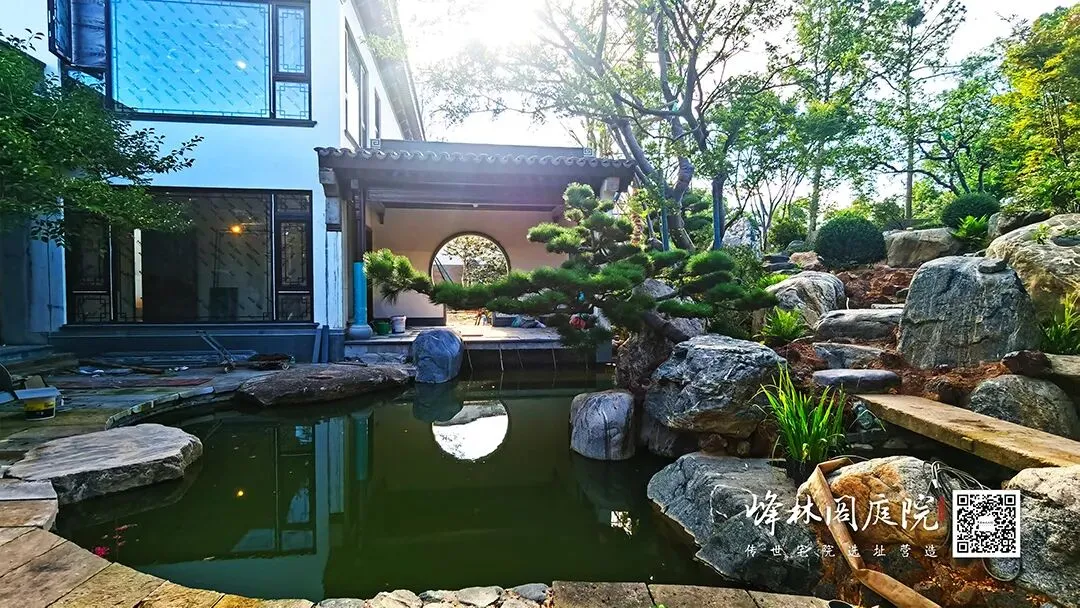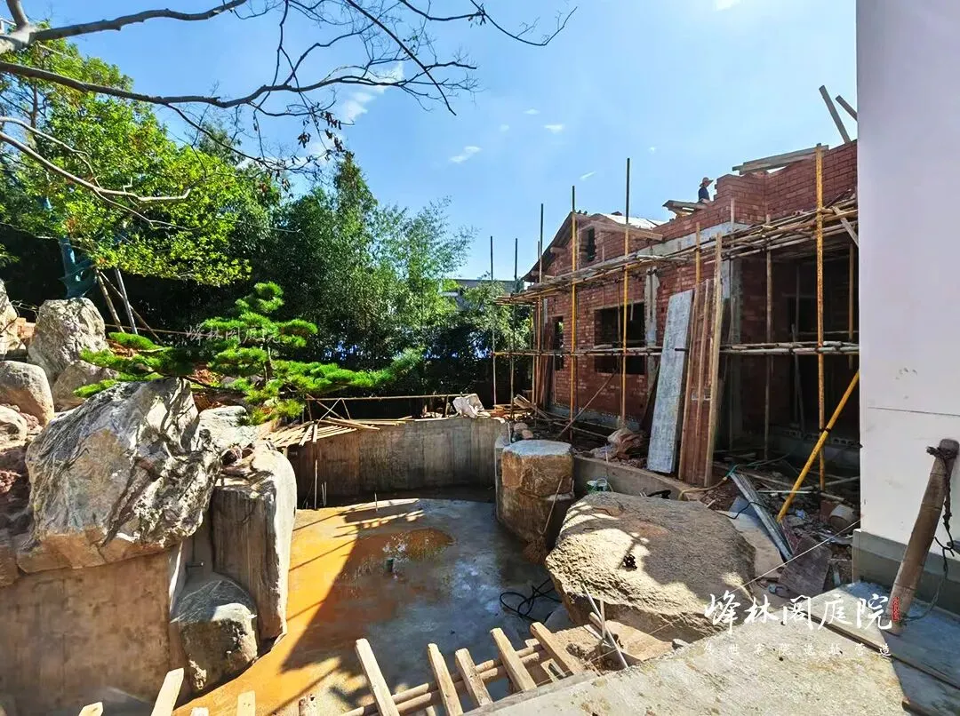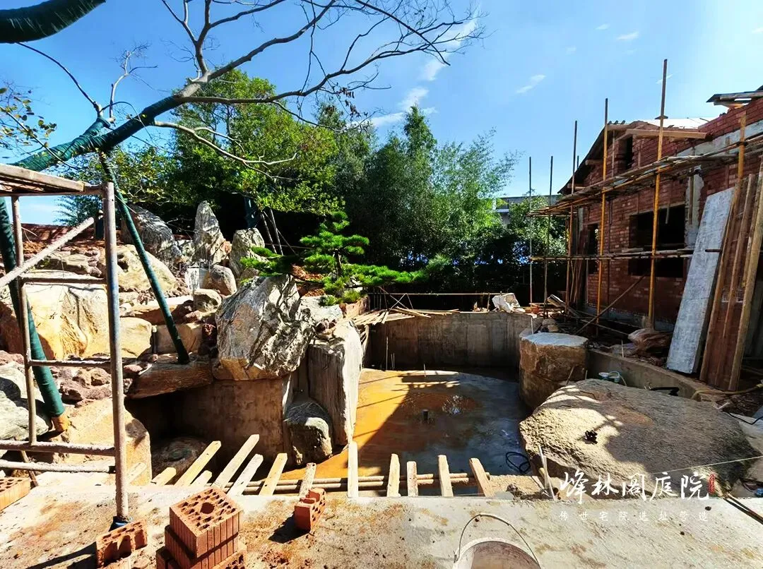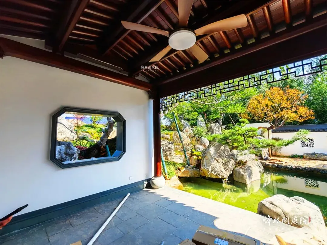 后院施工现场,一片热火朝天。月洞门把天光裁成圆,漏后半院鱼池的粼粼。工人正铺设石板小径,手中锤子精准敲击,石板严丝合缝。