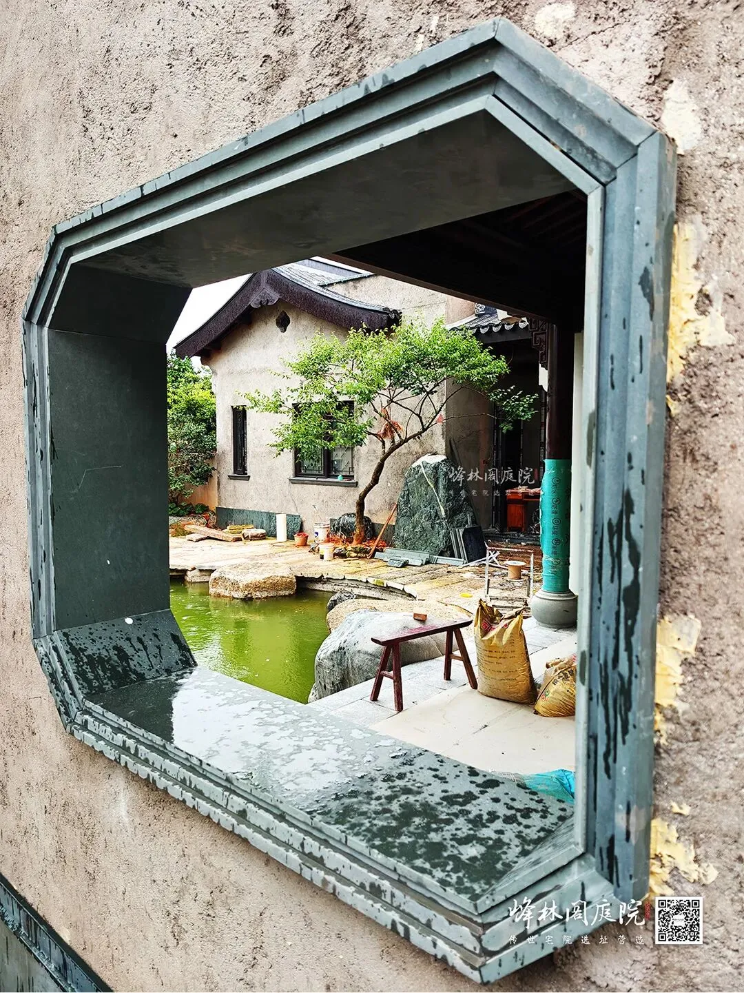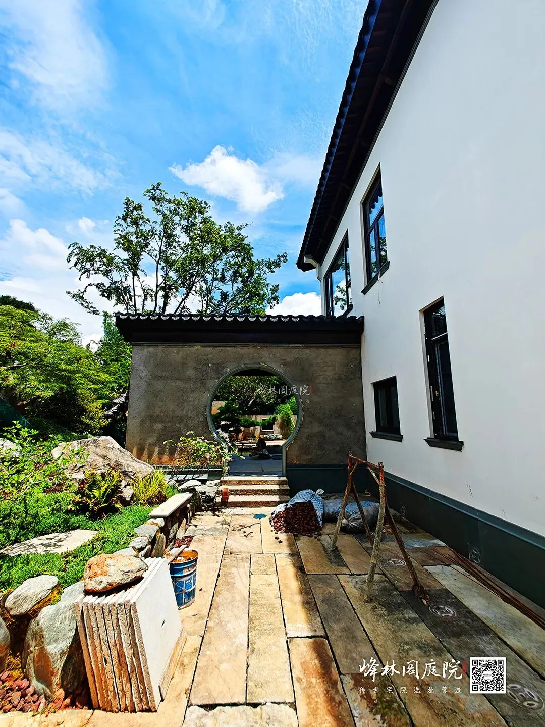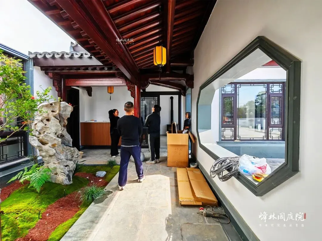 后院施工现场,一片热火朝天。月洞门把天光裁成圆,漏后半院鱼池的粼粼。工人正铺设石板小径,手中锤子精准敲击,石板严丝合缝。