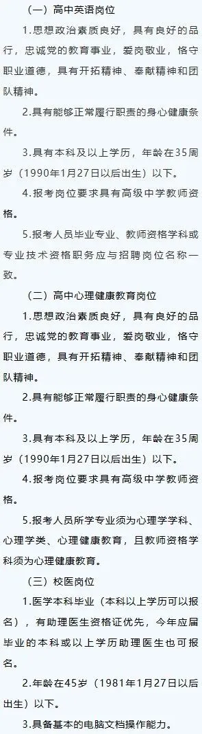 4.年龄:无工作经历要求岗位,年龄为28岁下,(即:1998年1月27日以后出生)有工作经历要求的岗位,年龄为35岁以下(即1991年1月27日以后出生)。