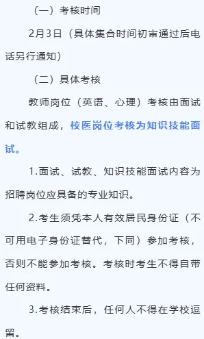 2、考核:学校根据报考人员提交的材料进行资格初审,并电话通知资格初审入围人员参加考核,请应聘者保持联络畅通。