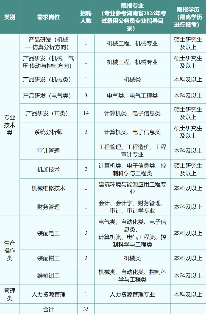 根据发展需要,常德烟草机械有限责任公司(简称常德烟机公司)拟公开招聘专业技术类、生产操作类和管理类岗位共35人。