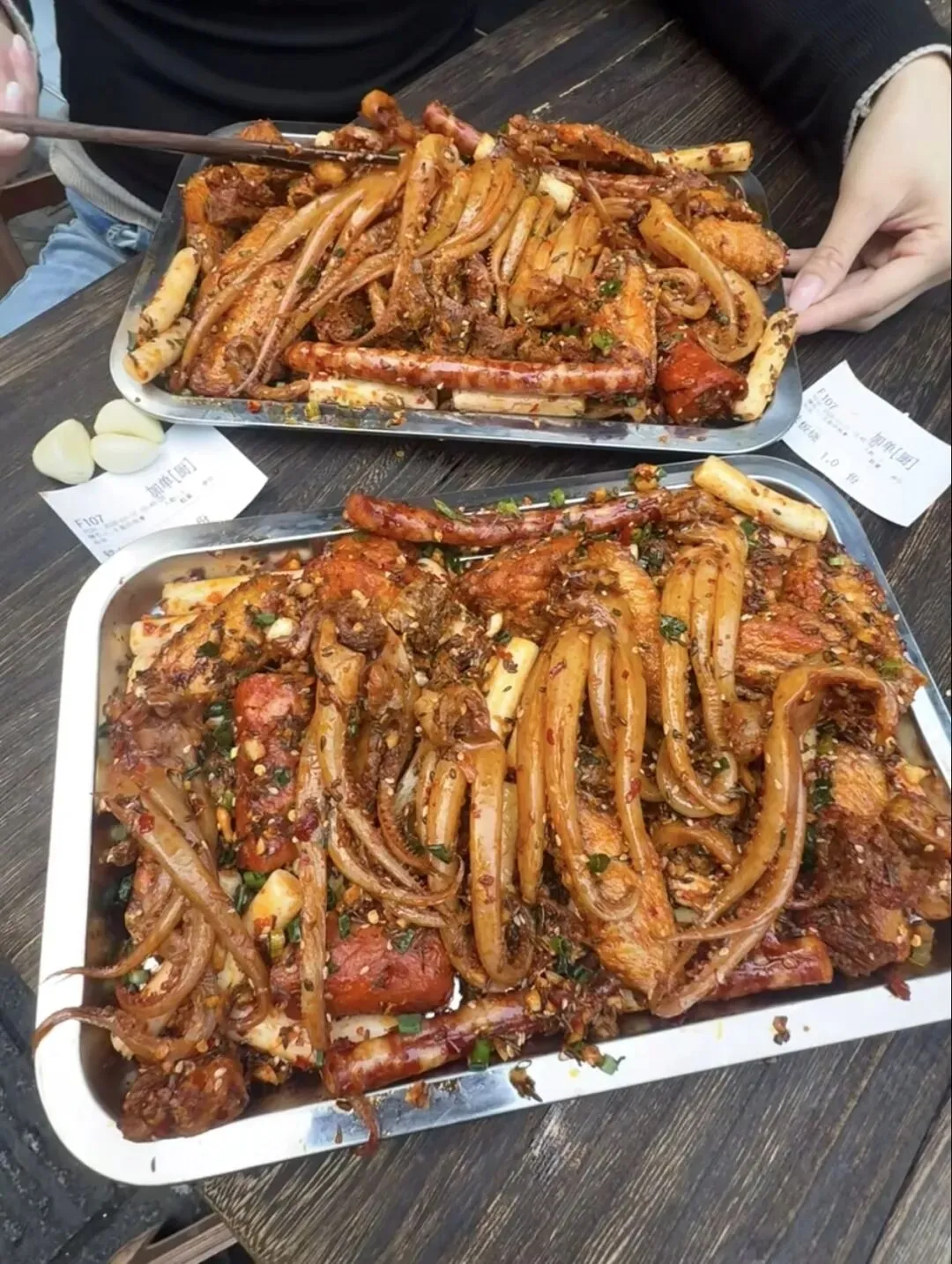 铁板烧和山楂糖醋桂花年糕排骨也必须说!铁板烧端上来还在滋啦作响,鱿鱼须卷曲着,冒着热气。咬一口,我的妈呀,这个嚼劲!又脆又弹,越嚼越香,根本停不下来!旁边那盘年糕排骨,颜色红亮亮的,看着就流口水。排骨炸得酥酥的,年糕糯叽叽的,裹着酸酸甜甜的酱汁,还有淡淡的山楂香和桂花香,特别开胃!我一口排骨一口年糕,不知不觉就扒完了一大碗饭!
