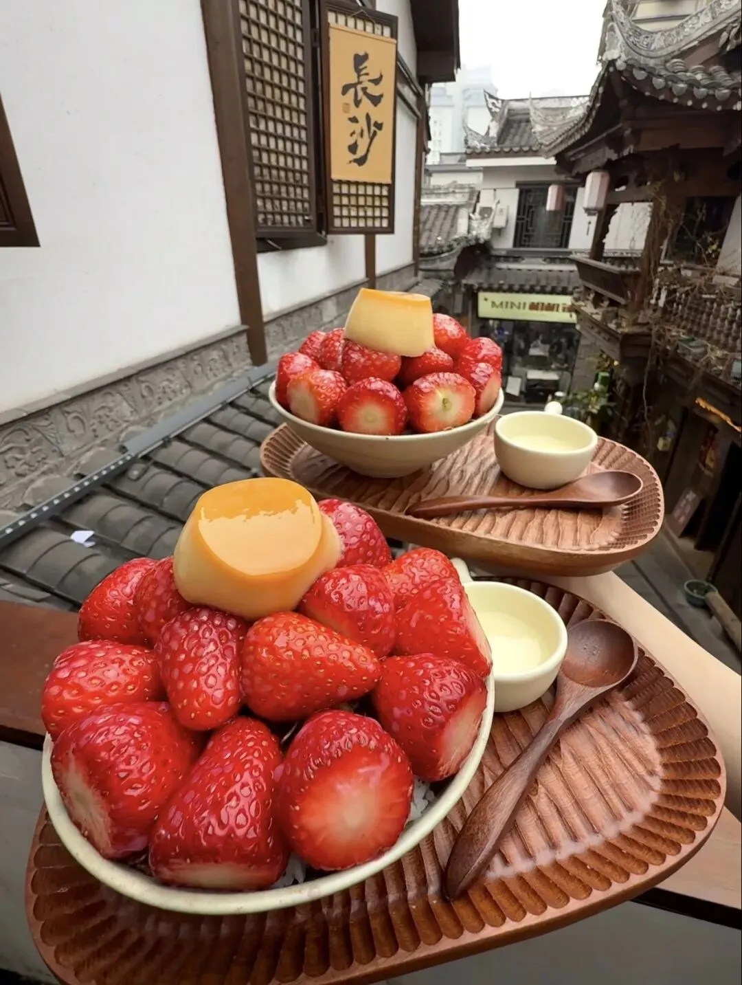 饭后的草莓芭菲杯和草莓布蕾云朵碗,我的天啊,这是什么神仙甜品!芭菲杯从上到下全是料——新鲜草莓、脆脆的麦片、香草冰淇淋、绵密的奶油,一勺子挖到底,冰的、脆的、软的、甜的全在嘴里了,巴适得不得了!