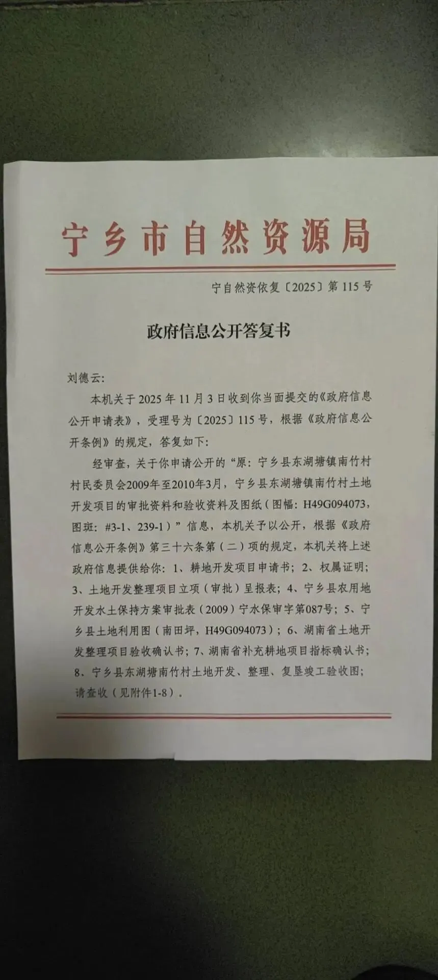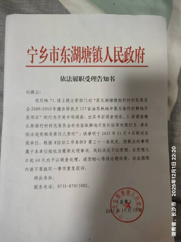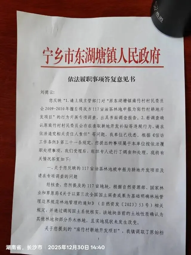 2、2025年9月28日下午,投诉方经营者刘德云前往宁乡市自然资源局咨询项目建设用地相关手续时,意外查询到被投诉方的历史违规事实:原宁乡县东湖塘镇南竹村村民委员会在2009年8月至2010年3月期间,在未履行任何告知义务、未与投诉方协商的前提下,擅自将投诉方投资开垦、种植的460余亩油茶林地其中的117亩,套取申报了“宁乡县东湖塘镇南竹村土地开发项目”。投诉方作为该117亩林地的合法承包经营方及唯一投资方,对该耕地开发项目的申报和审批全过程完全不知情,且被投诉方未对该117亩油茶林地投入任何资金和人力成本。(该项目位置:在原南竹村栗山嘴、南竹山、水果塘组的山地处与我方油茶基地位置重复;图幅号:H49G094073;图斑号:#3-1、239-1;项目验收批文号:宁国土资源发〔2010〕21号)。