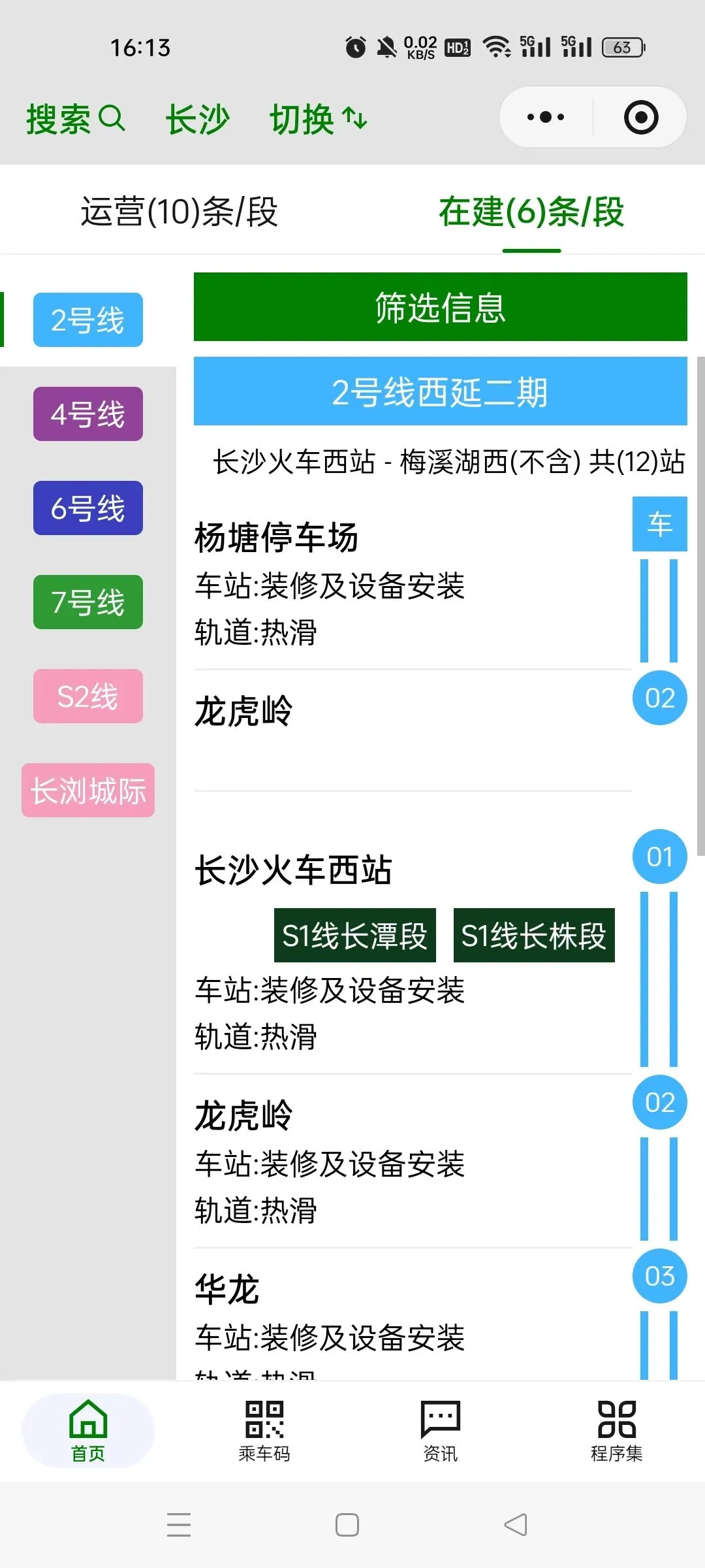 2号线西延二期(长沙火车西站-梅溪湖西),计划开通时间:2026年。12座地下车站中,1座已开通,11座已封顶,其中11座装修及设备安装;24个轨行区间中,24个已贯通,其中24个热滑。杨塘停车场装修及设备安装,出入线热滑。