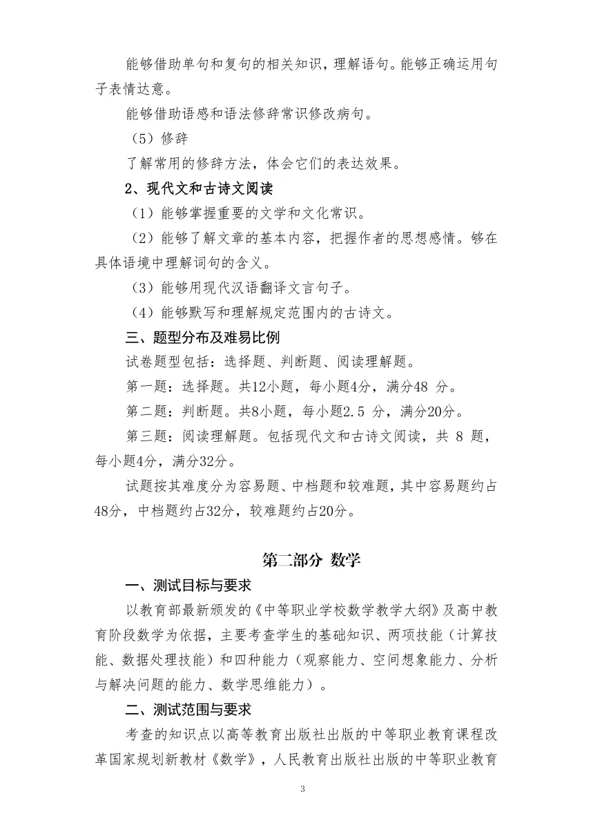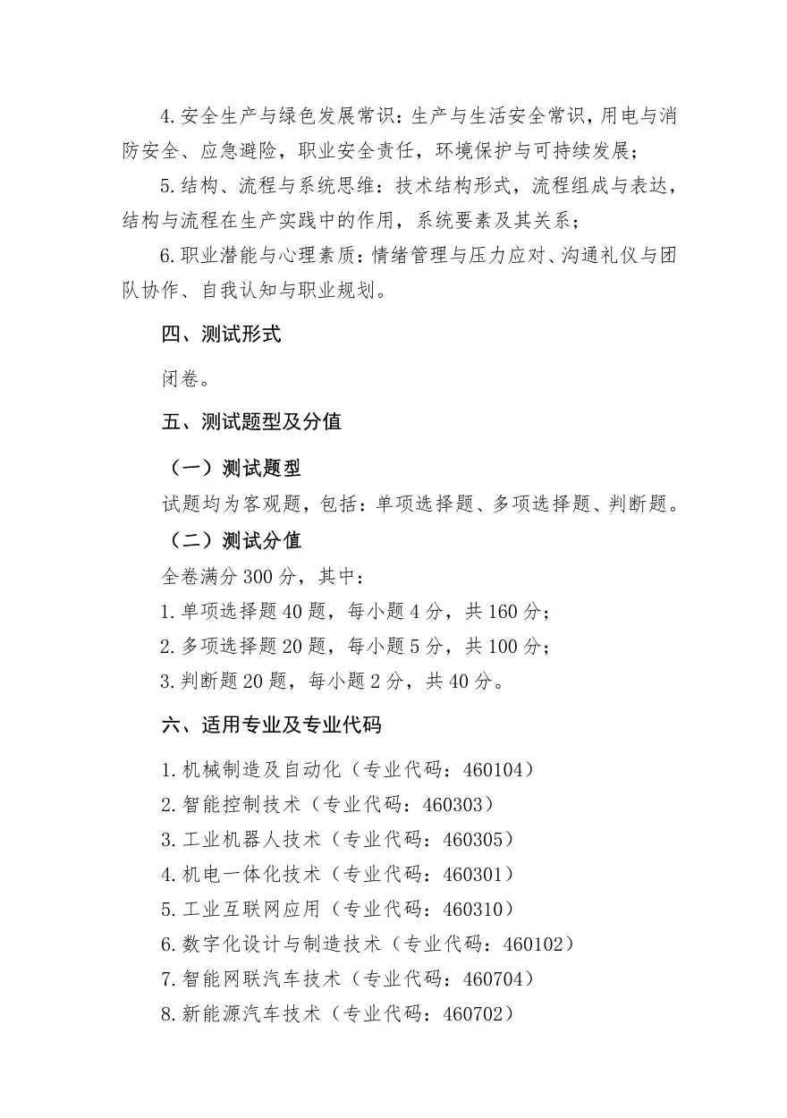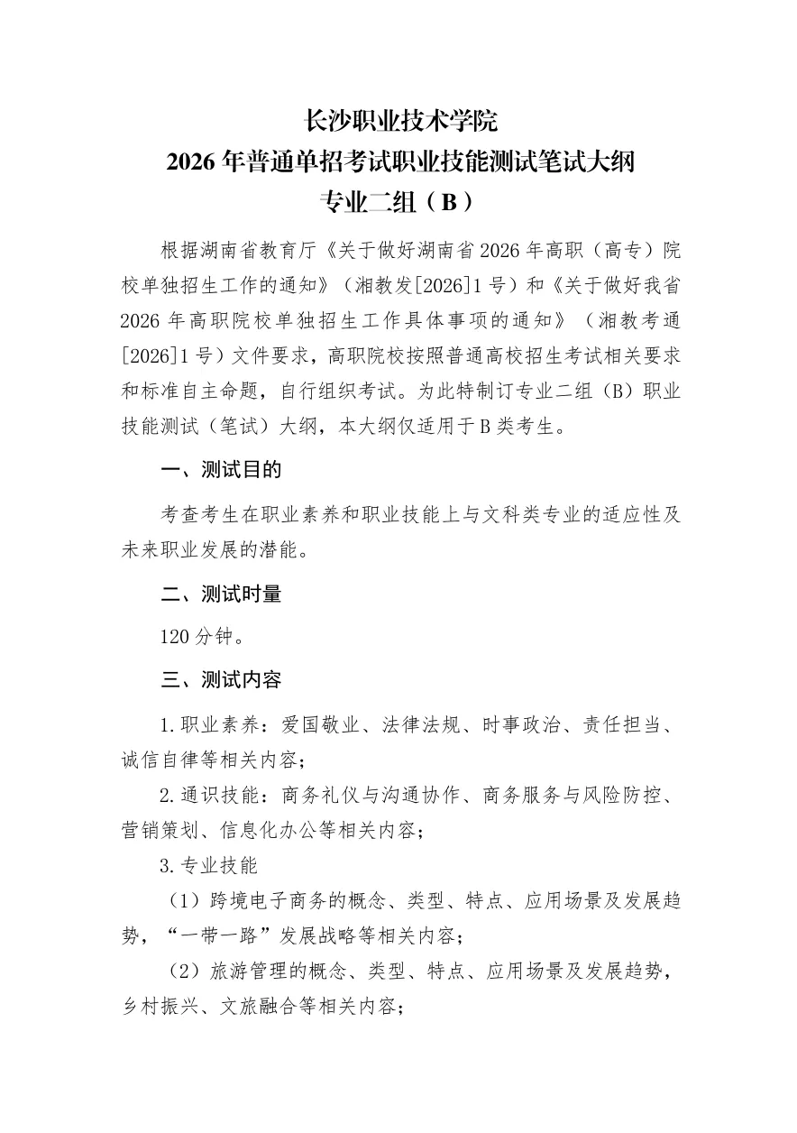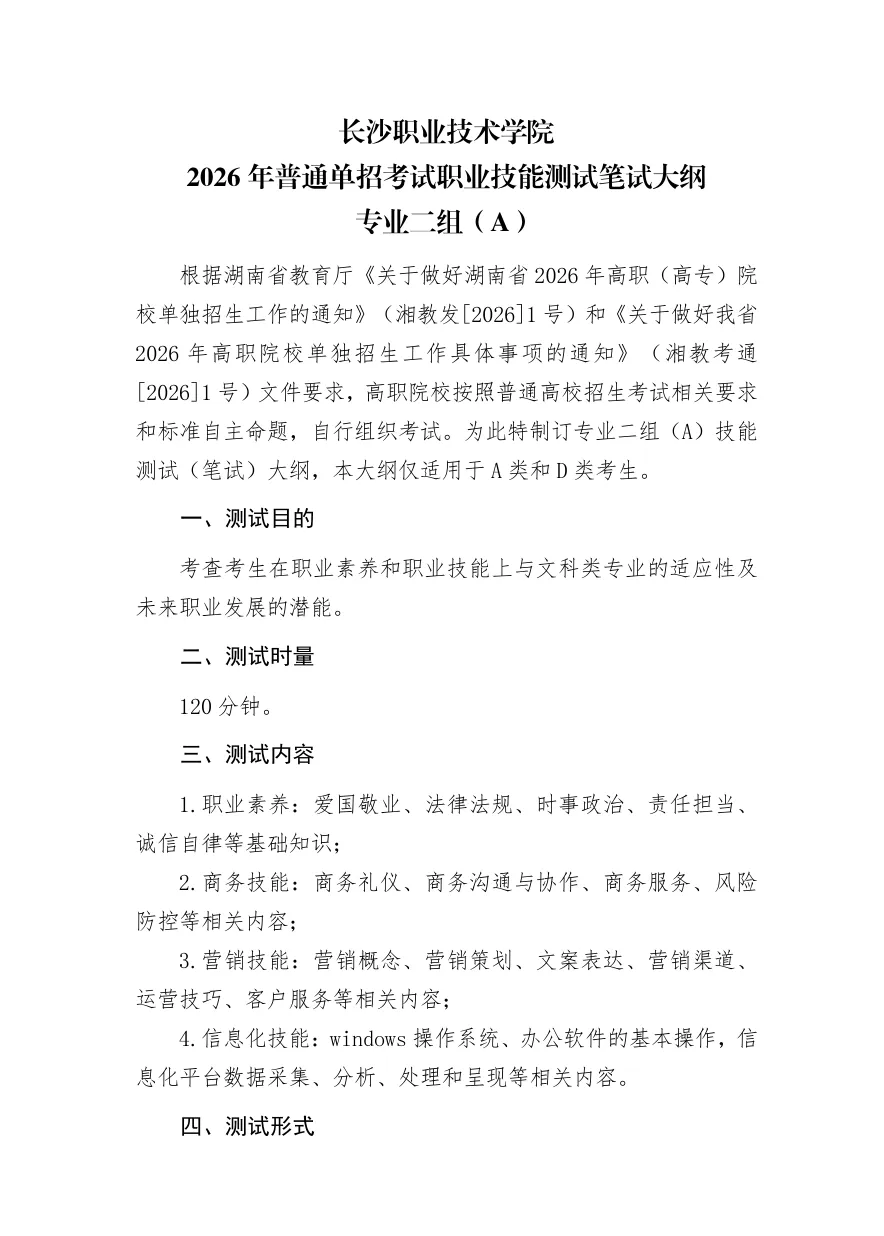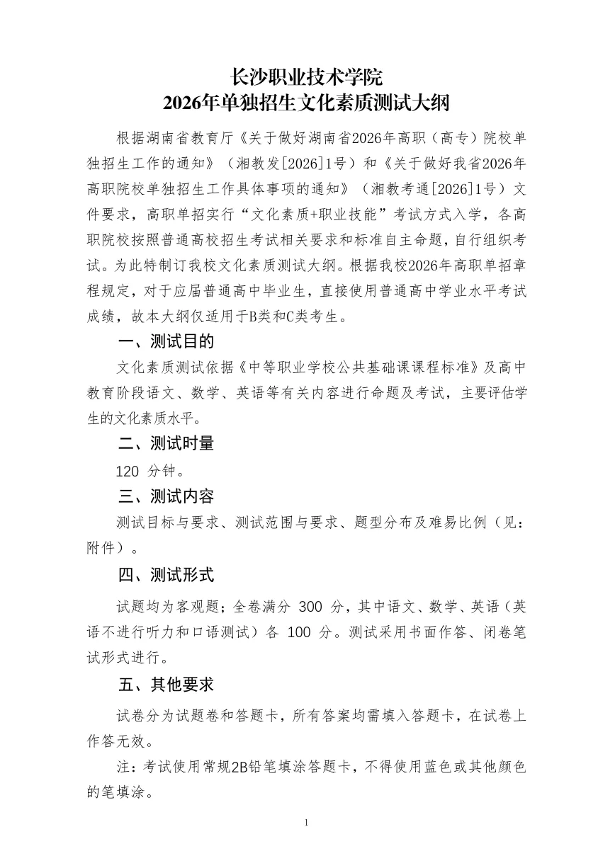 长沙职业技术学院2026年单独招生考试大纲