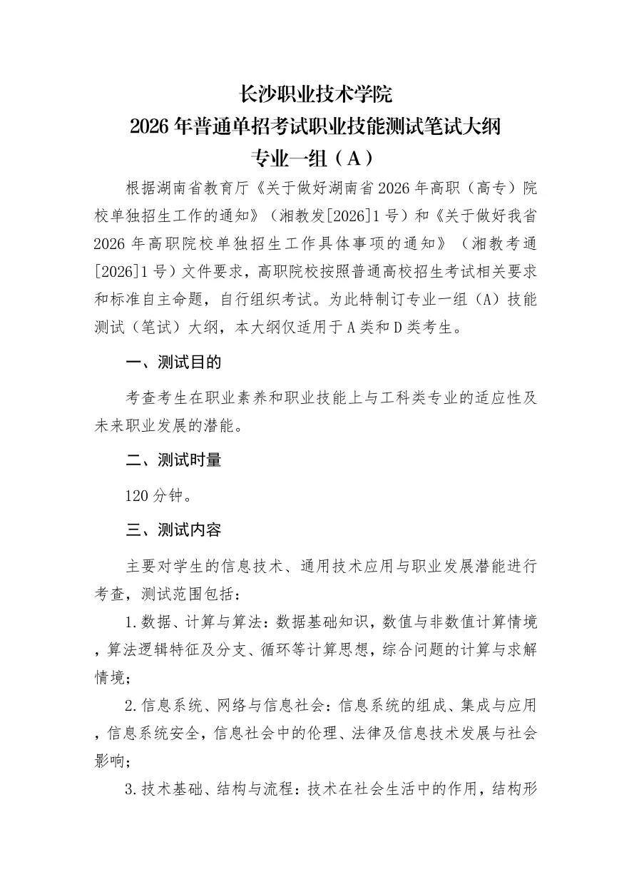 >长沙职业技术学院2026年单独招生考试大纲