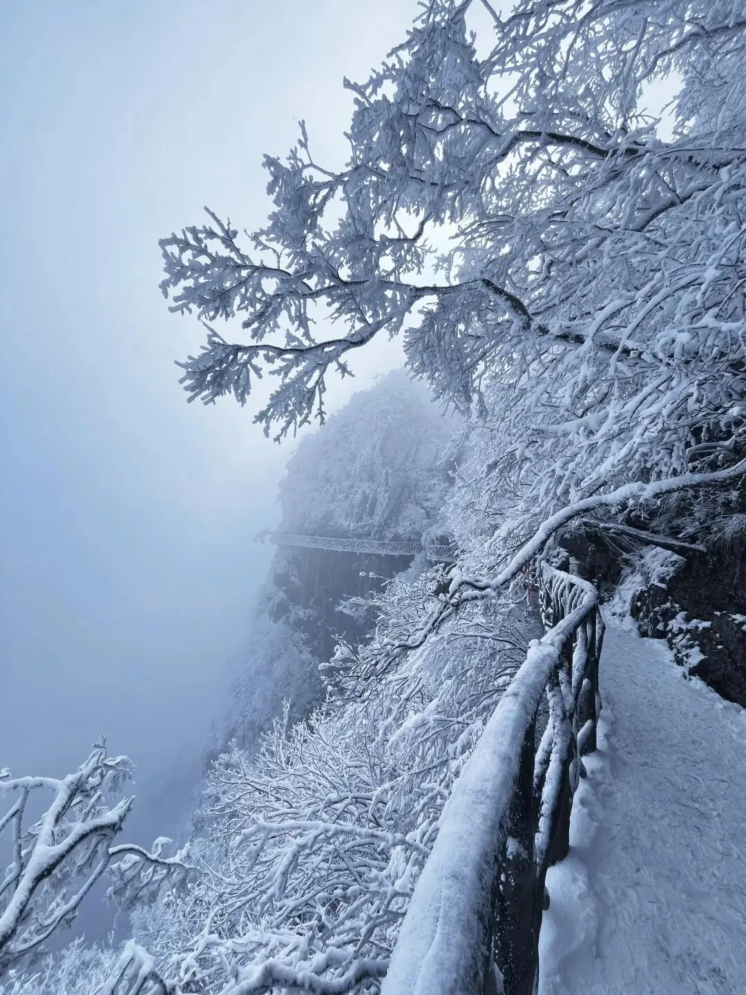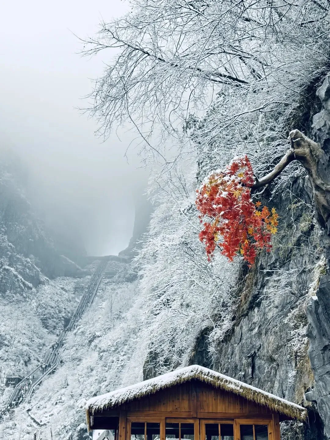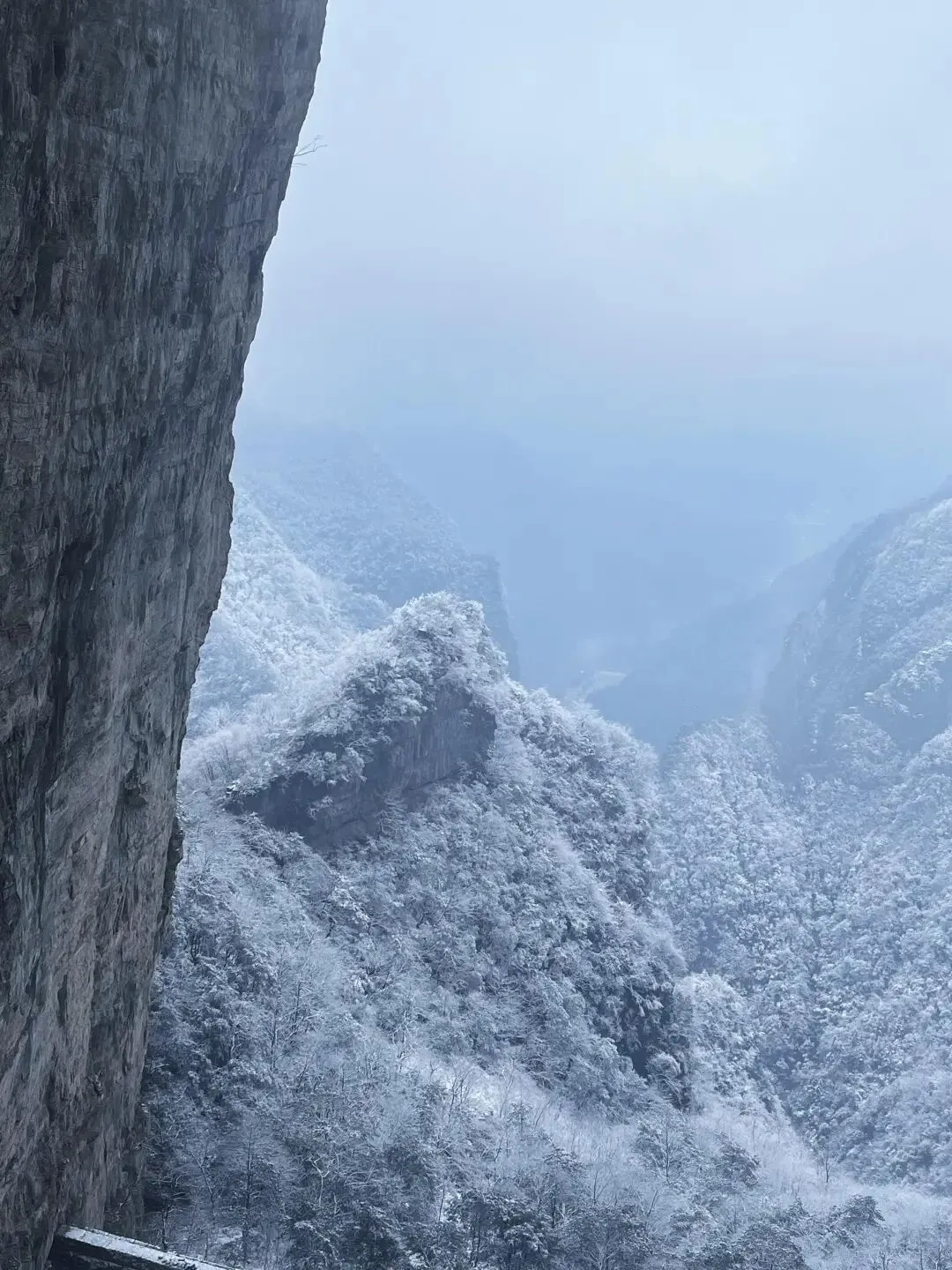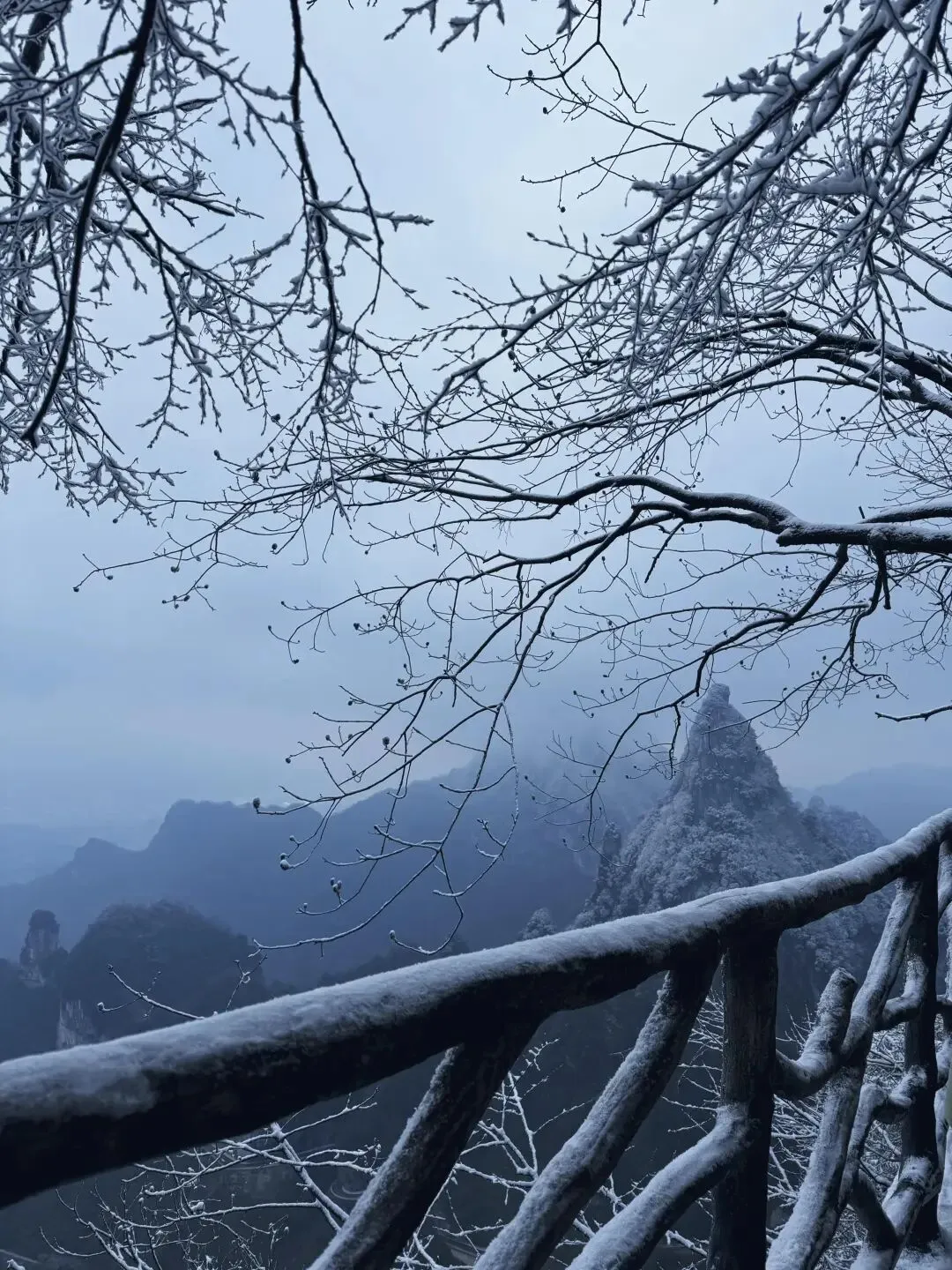 我常常在想,天门山的这种“奇”,不仅仅在于它的喀斯特地貌,更在于它那种自带的神秘磁场。在那些银装素裹的游道上,雾凇冰棱比比皆是,游客们三五一群地拍照,导游博主们对着镜头直播。而在这些热闹之外,那些静默的峰石似乎依然保存着两千年前的记忆。不管是赤松子隐居修炼的赤松峰,还是形似僧帽的和尚脑,在白雪掩映下,都透着一种出世的超然。这种美,是属于勇敢者的,因为你必须忍受山顶低于20℃的清冽,才能换来这一场“玉树银花”的相遇。在这里,历史的小故事与自然的造化完美融合,让人在登顶的那一刻,忘却了凡尘的所有烦恼。