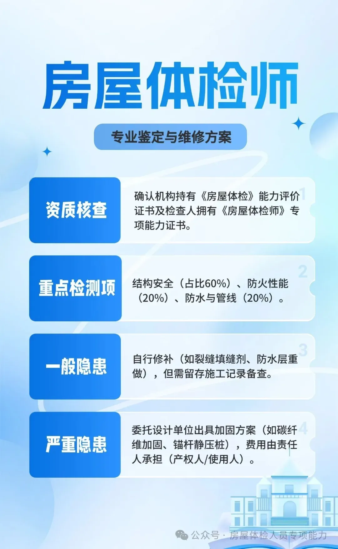 而这一系列实践的落地,离不开房屋体检师这一核心专业力量的支撑,其职业发展正迎来政策与市场的双重红利,未来大有可为。作为具备建筑专业知识、能熟练运用智能检测设备的专业人才,房屋体检师不仅要完成结构安全、设施性能等全维度检测,更要建立房屋“健康档案”、提供精准修复建议,是连接建筑安全与城市韧性的关键一环。