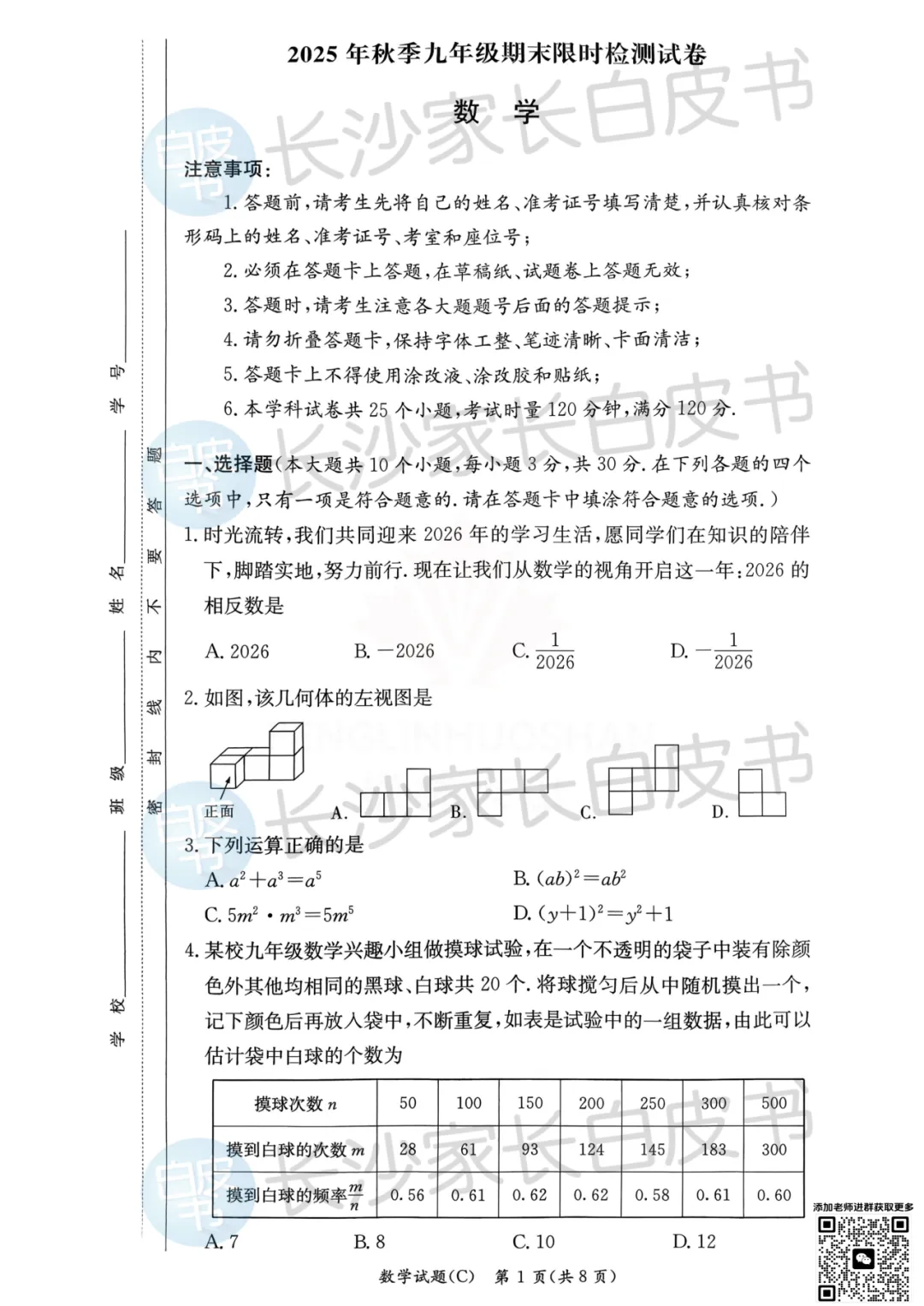2026年长郡&雅礼初三上期末联考数学试卷