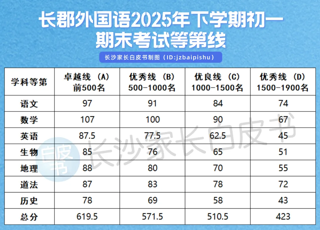 长郡外国语初一期末考试等第线