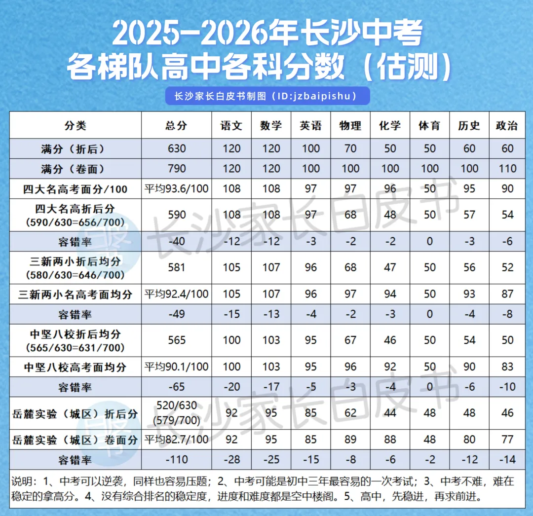 2026年中考,长沙总分630分(卷面790分)。假如中考难度不变,今年中考考生想上四大,各科要多少分?