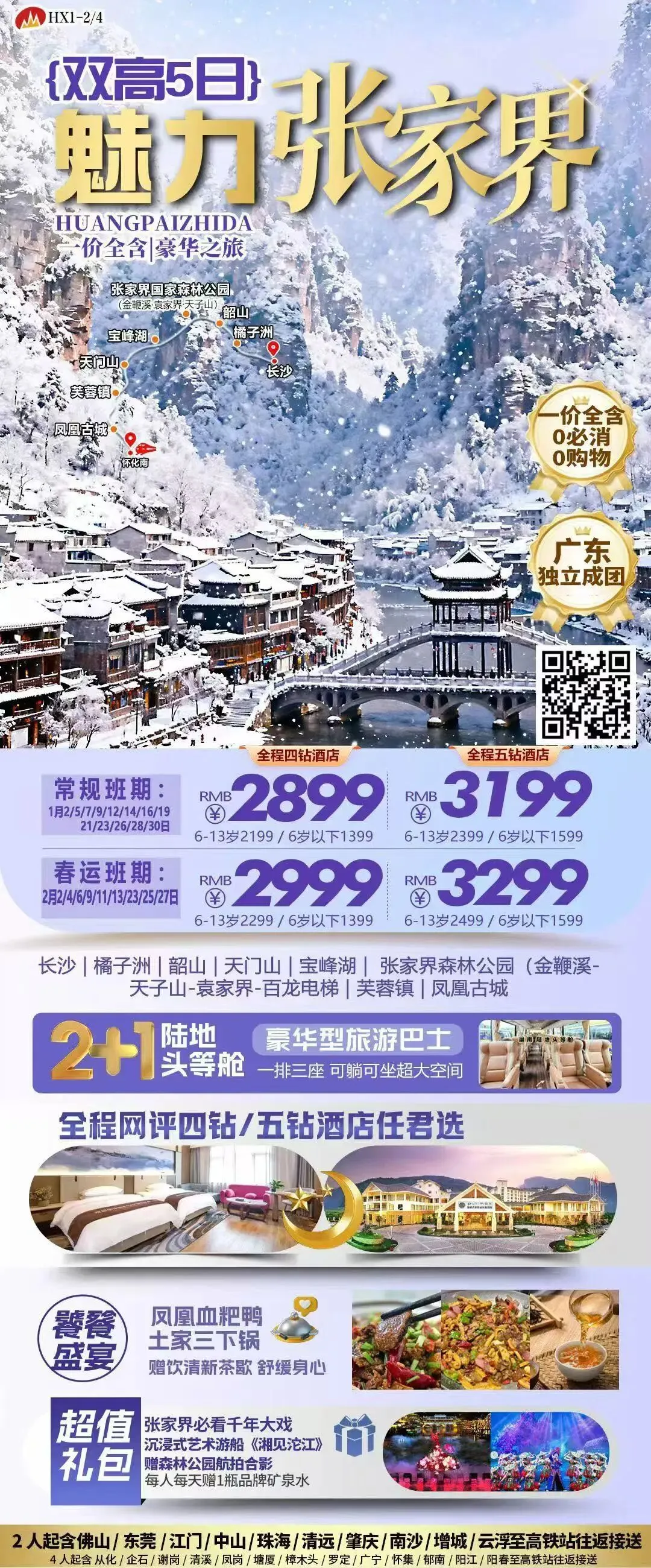第四天:天门山森林公园→芙蓉镇→凤凰古城→《湘见沱江》早餐后乘车前往游览【天门山国家森林公园】(含门票和进山大索道费用+玻璃栈道鞋套+天门洞扶梯,游览时间约4小时)乘坐“世界第一长高山客运索道”,索道全长7455米,海拔1279米,体验腾云飞翔的刺激震撼,登张家界之巅云梦仙顶,俯瞰张家界全景,俯瞰九十九道弯的公路奇观【通天大道】;游览【鬼谷栈道】,在悬崖上欣赏风景,带着急促的心跳,脚下是没有边际的绿野,伸开双臂,你就能得到一次最完美、最刺激、最贴近自然的完美SPA;还有惊险刺激的悬空【玻璃栈道】挑战你的高空极限,观赏奇妙美丽的盆景花园,游览盆景石区。山体孤峰高耸,气势临空独尊,世界最优秀的翼装飞侠杰布·科里斯的惊天挑战也曾在此举行。游览悬于千寻素壁之上的天然穿山溶洞【天门洞】,南北对开,气势磅礴,巍峨高绝,是罕见的高海拔穿山溶洞,更是尽显造化神奇的冠世奇观,从而拥有终身难忘的旅游体验。下乘车(车程约2.5小时)前往【芙蓉镇】(景区门票已含,电瓶车已含),芙蓉镇,原名王村,是一个拥有两千多年历史的古镇,因姜文和刘晓庆主演的电影《芙蓉镇》在此拍摄,更名为“芙蓉镇”;这个挂在瀑布上的小镇,楚蜀通津,曾是王者之村,请停下脚步,只有慢慢发现,才能细细品尝, 沿着五里石板街,历史的倒影,拾级而上,竹桶酒,阵阵清香,桂花鱼,鲜嫩味美,这里的美味留你尝,这里人的热情绊你的腿,豆腐西施歌一曲,余音添韵味。在这清幽古镇边走边逛,还可以去品尝一下正宗的芙蓉镇刘晓庆米豆腐;晚上可漫步古街,感受边陲小镇的风土人情... ...乘车(车程约2小时)赴最美小城【凤凰古城】(赠送古城接驳车;注:凤凰古城不含九景门票,若因政府政策性变化,若需购票敬请自理)赠赏沉浸式艺术游船演艺《湘见沱江》夜幕将至,华灯初上,沱江两岸在游人如织,热闹非凡。在美丽的沱江夜色之中,游客们乘着游船,感受苗族的风土人情,欣赏国风的光影科技。游客们泛舟缓缓而下,感受充满特色苗寨风情码头、唯美的翠翠竹排表演、壮阔的黄永玉百米画卷、晨光中的水上油菜花田、穿越苗族时空的虹桥隧道、龙潭渔火中爷爷的渔船、浪漫的沈从文情诗水幕、梦幻的湘见·沱江主题光影表演、震撼的苗族太阳神鼓电光秀,美轮美奂,惊艳世人。人在船上,船在水上,水在景里。来自全国各地的游客在视听盛宴中,走进文学巨匠沈从文笔下的《边城》世界,品文学经典,体验浓郁民族风俗,感受翠翠和傩送之间真挚感人的爱情故事,在流光溢彩的光影互动体验中,欣赏河上全新打造的绚烂光影效果和灵动写意的国风视听。一步一景,雾锁烟迷,恍若仙境,宛若置身于美不胜收的十里画廊中。①、因凤凰古城当地旅游地方性保护,进入凤凰古城地界前,我社会安排凤凰当地导游在凤凰段陪同讲解,介绍凤凰当地风土人情。另,凤凰古城进城免费,不含小景点门票,如遇景区政策临时变动,敬请自理门票50-128元/人,具体价格以景区公布为准。②、凤凰古城为敞开式商业老街,凤凰导游义务介绍,旅游者购物行为为自主选择,旅行社不接受凤凰区域旅游者在小商铺购物方面的投诉及退换货的要求。建议有购物需求的旅游者提前了解相关信息,尽量选择资质齐全的购物商城或政府授牌的大型商铺。如有购买请保留好小票及售后联系方式,日后如有售后需求以便联系。早餐后于沱江边漫步,欣赏【凤凰晨景】(游览时间约3小时)沿青石板路步行至“网红翠翠街”,这条古街应证了千年厚重的历史文化沉淀,集休闲,娱乐,购物,民俗于一体,沿街有苗家扎染、蜡染、银饰、挑花、刺绣等多种多样的民间工艺品以及众多风味小吃;参观有代表性的熊氏蜡染铺、陈家老号姜糖、阿牛血粑鸭、吴花花的扎染铺、王春的“苗家小铺”等众多工艺美食店铺。欣赏沈从文笔下的沱江吊脚楼,远眺画家黄永玉夺翠楼……游览结束后乘车前往怀化南送团(车程约1.5小时),乘高铁返英德西,行程愉快结束!①、请提前收拾好个人物品,仔细检查个人物品,确保没有遗漏在酒店或景区。贵重物品如身份证、护照、钱包、手机等请一定要随身携带好,准时到达集合点,避免耽误行程。②、最后行程乘车前往送团,过程中,请系好安全带,遵守交通规则,保持车内安静和整洁。如果晕车或身体不适,请提前告知导游,我们会尽力提供帮助。③、本次旅行是我们共同的美好经历,希望大家在返程后,能通过照片、视频等方式分享旅途中的精彩瞬间,让这份美好得以延续。如果您对本次旅行有任何意见或建议,欢迎随时与我们沟通,我们会不断改进,为大家提供更优质的旅游服务;交通:含英德西→长沙南;怀化南→英德西二等座 高铁往返,无任何差价可退。请至少提前1小时到站,自行乘车前往目的地!请所有出游旅客必须携带本人有效身份证,无证者所造成损失由旅客自行承担。铁路票务系统随机出票,所以高铁票有可能不在同一车厢及成人与小童的票有可能出不到一起,可自行与其他乘客进行调座,请您知悉。特别说明:根据实际出票情况不同,此行程可能会调整进出港口和游览景点顺序,景点和路线标准不变,敬请知悉。门票:含韶山、橘子洲、宝峰湖、张家界国家森林公园-百龙天梯-天子山索道、大型湘西民俗演艺表演、天门山、芙蓉镇、凤凰古城(免大门票,古城内九景套票自由选择是否购买)赠送项目:森