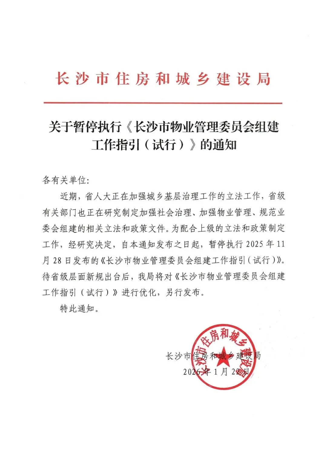 在多元主体的合法性审查压力下,长沙市住建局于2026年1月22日制发《关于暂停执行<长沙市物业管理委员会组建工作指引(试行)>的通知》,正式决定暂停文件执行。通知内容显示:- 暂停理由:近期省人大正在加强城乡基层治理立法工作,省级部门也在研究制定物业管理相关政策文件,为配合上级立法和政策制定,决定暂停执行《指引》。