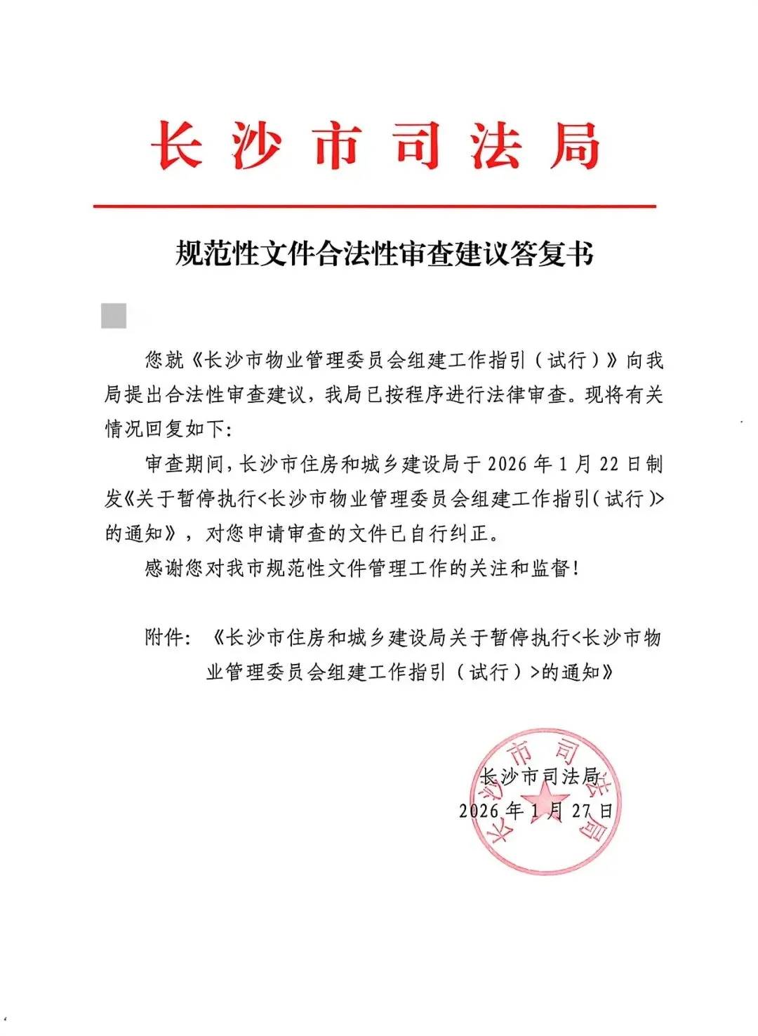 2026年1月27日,长沙市司法局向宋先生等申请人出具《规范性文件合法性审查建议答复书》,明确告知“审查期间,长沙市住房和城乡建设局于2026年1月22日制发通知,对申请审查的文件已自行纠正”,并感谢申请人对规范性文件管理工作的监督。四、事件启示:基层治理需坚守法治与自治平衡