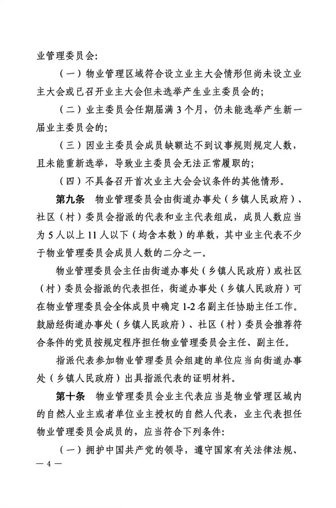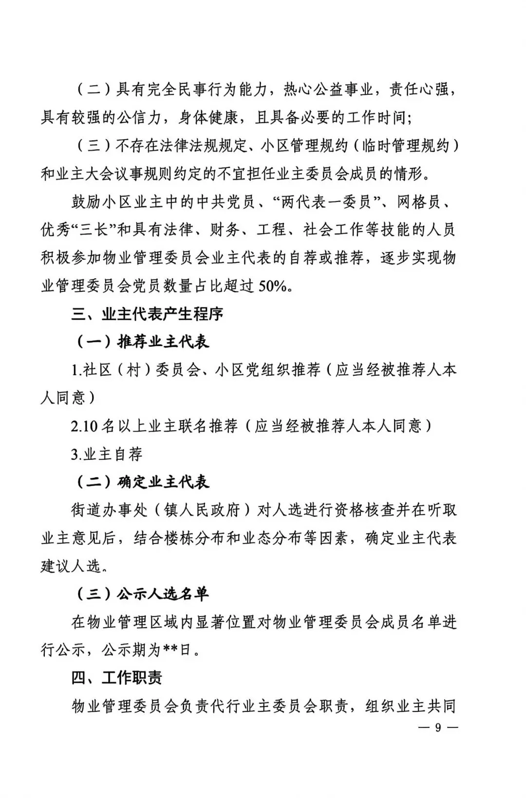 - 行政干预取代业主选举:第九条要求物管会主任由街道或社区指派,与《物业管理条例》中“业主委员会主任由业主推选”的规定直接冲突,侵犯业主选举权。