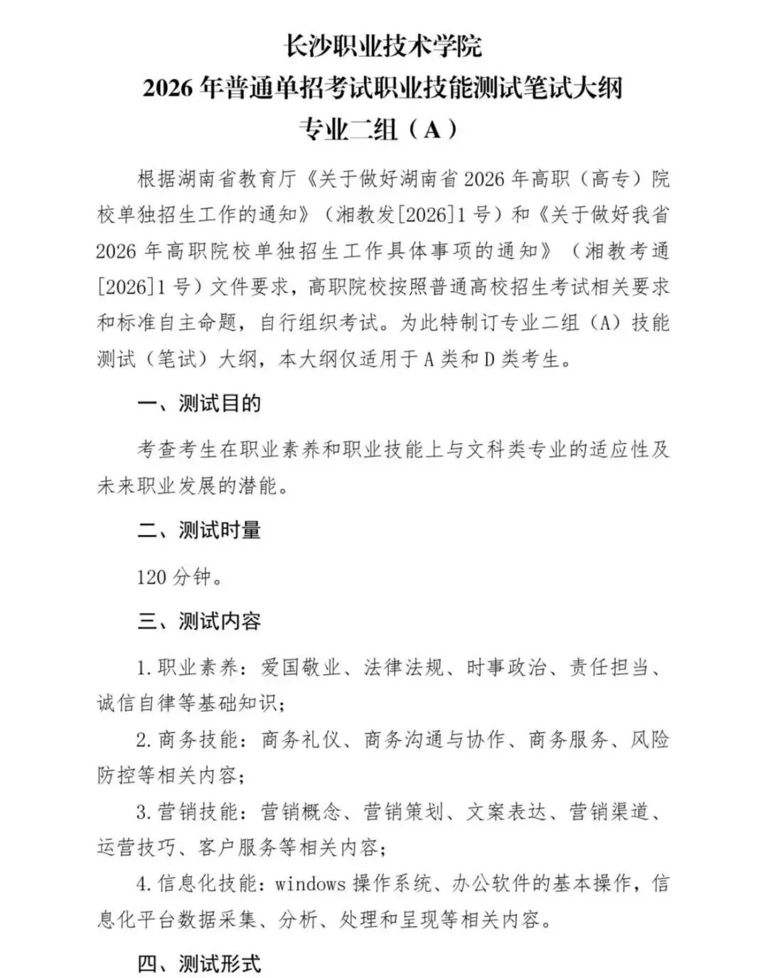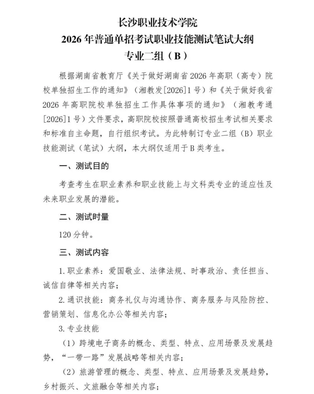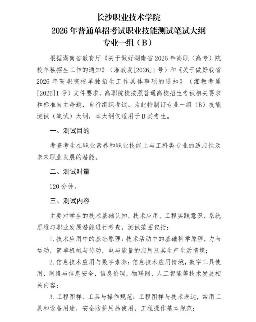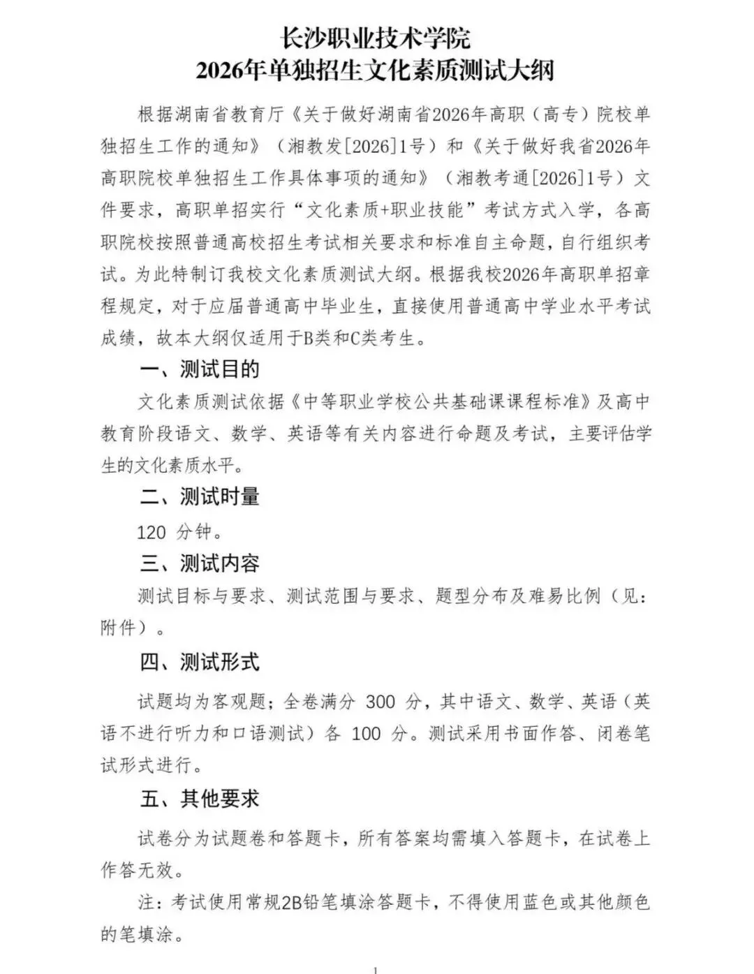 >2026年湖南单招 | 长沙职业技术学院单招考试大纲