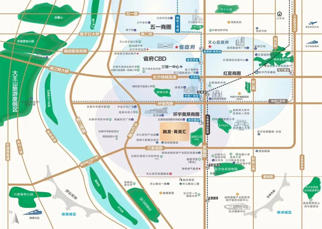 1. 交通出行便捷:距地铁1号线尚双塘站约300-500米,30分钟直达五一广场,紧邻长株潭城际轻轨,自驾依托芙蓉南路也能快速出行。