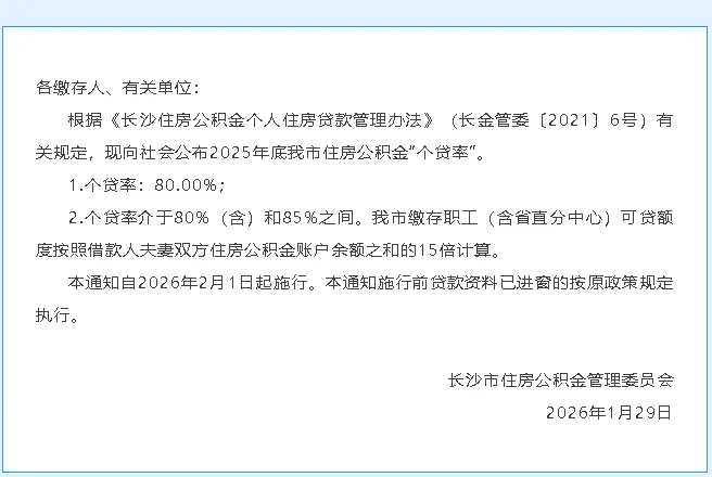 根据《长沙住房公积金个人住房贷款管理办法》(长金管委〔2021〕6号)有关规定,现向社会公布2025年底我市住房公积金“个贷率”。