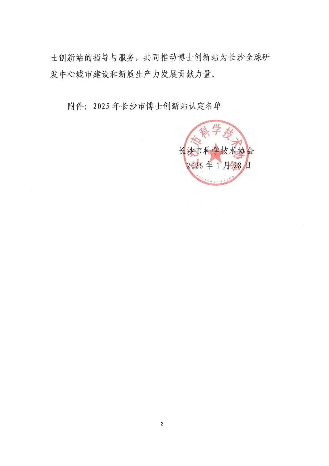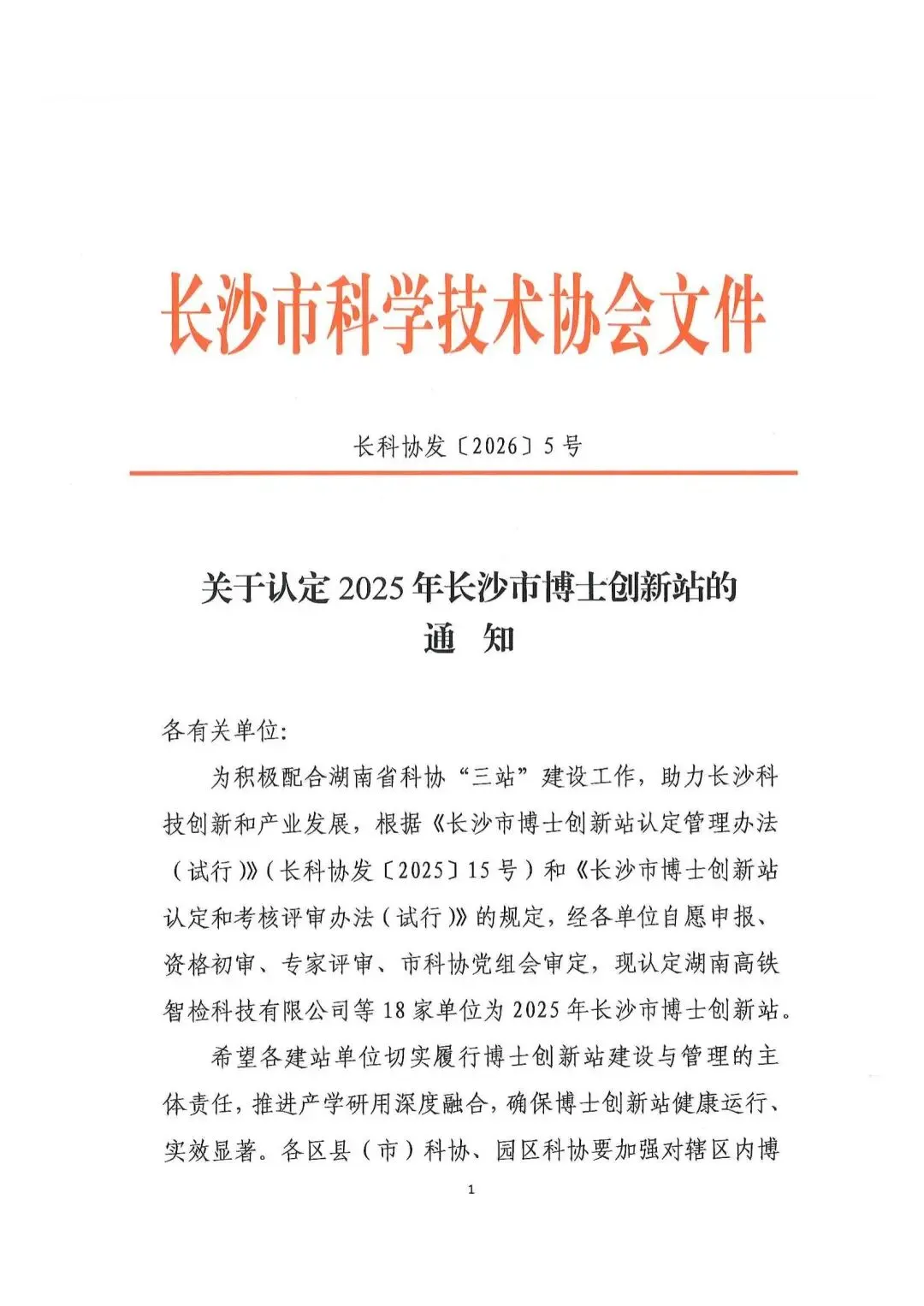 为积极配合湖南省科协“三站”建设工作,助力长沙科技创新和产业发展,根据《长沙市博士创新站认定管理办法(试行)》(长科协发〔2025〕15号)和《长沙市博士创新站认定和考核评审办法(试行)》的规定,经各单位自愿申报、资格初审、专家评审、市科协党组会审定,现认定湖南高铁智检科技有限公司等18家单位为2025年长沙市博士创新站。希望各建站单位切实履行博士创新站建设与管理的主体责任,推进产学研用深度融合,确保博士创新站健康运行、实效显著。各区县(市)科协、园区科协要加强对辖区内博士创新站的指导与服务,共同推动博士创新站为长沙全球研发中心城市建设和新质生产力发展贡献力量。