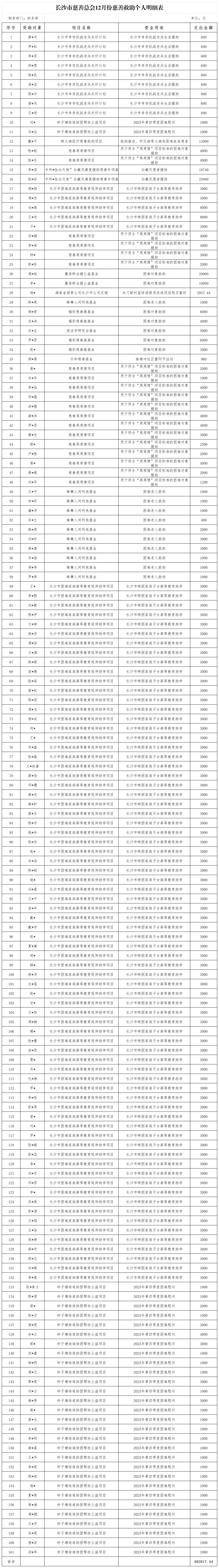 2025年12月,长沙市慈善总会通过项目救(援)助、定向救(援)助等方式,共支出救(援)助款2029561.53元(详见附件1),其中个人救助支出492017.44元(详见附件2),现予以公示。
