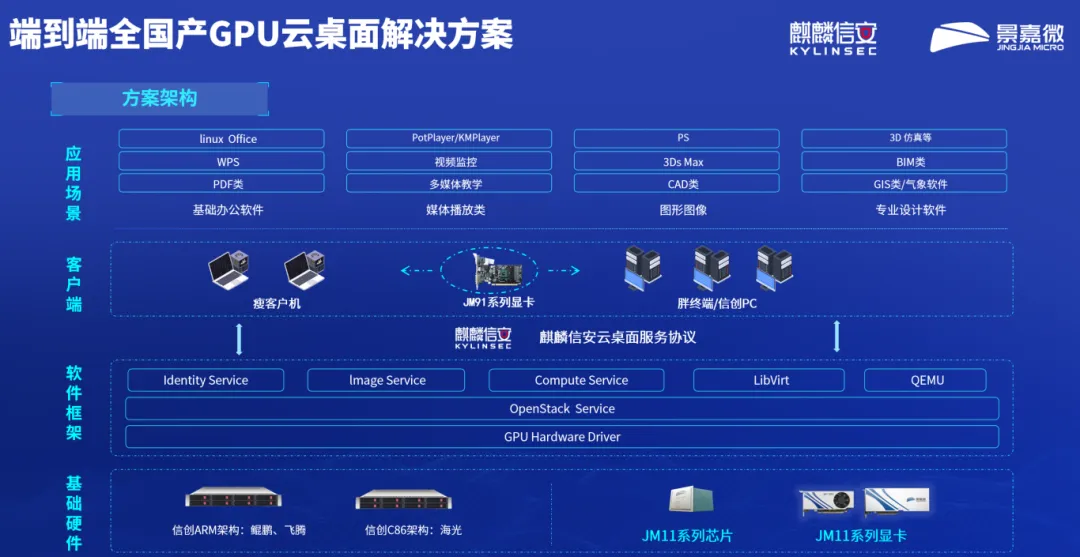作为国产GPU领域的领军企业的景嘉微,同样是国家专精特新“小巨人”企业,其自主研发的图形处理芯片打破国外垄断,11系列GPU更是凭借高性能、高可靠性成为国产化算力平台的核心硬件支撑。目前,企业的芯片技术已广泛应用于政务、国防、工业等关键领域,为国产化替代提供了核心硬件保障,此次与麒麟信安的合作将实现“芯片—操作系统—应用”的全链条贯通。