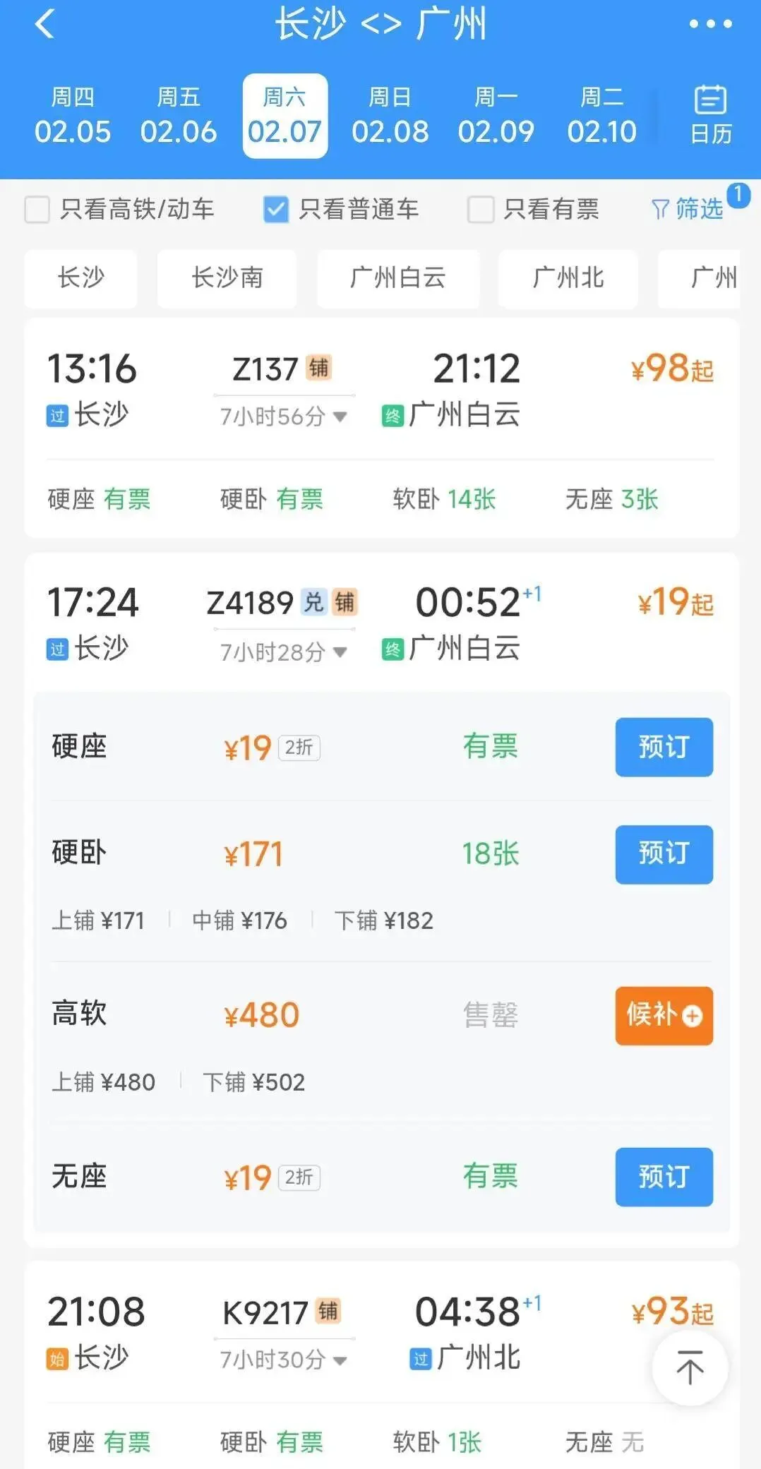 记者查询12306APP发现,此次18元低价硬座票对应长沙至广州白云或广州北的普速列车,全程耗时约8小时(部分车次7小时41分钟),为原价93元硬座票的2折优惠,同时硬卧票也同步推出5折优惠,折后低至81元,部分车次实现夕发朝至,适配时间灵活的出行人群需求。目前春运期间(2月10日前后)该方向优惠车票仍有部分余票,其余时段长沙至广州普速列车硬座票价多为93元或98元,高铁票价则在170元至300元不等。