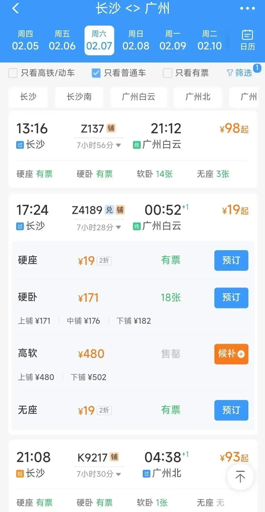 目前春运期间(2月10日前后)该方向优惠车票仍有部分余票,其余时段长沙至广州普速列车硬座票价多为93元或98元,高铁票价则在170元至300元不等。