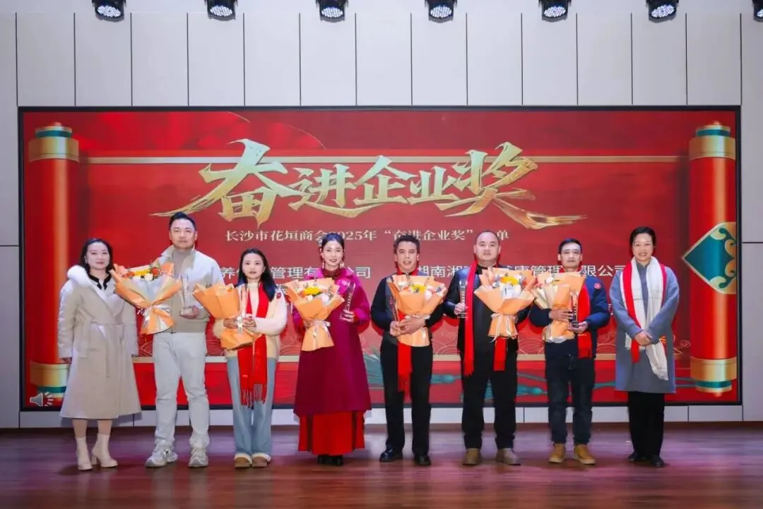 商会副会长向沅宣读了长沙市花垣商会2025“奋进企业奖”获得企业名单。花垣县委常委、统战部长石娟,湘西州人民政府驻长沙办事处副主任凌雯共同上台,为获得企业颁奖。
