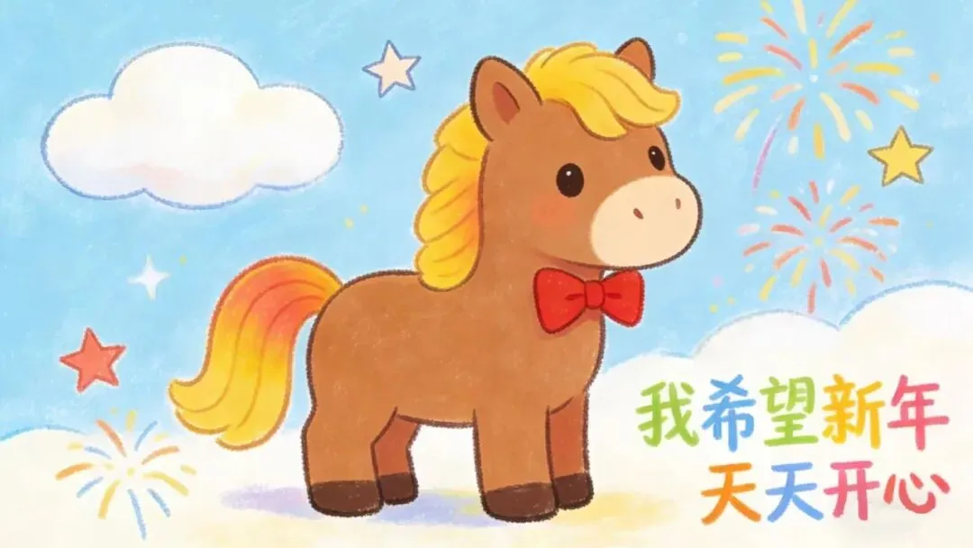 用彩笔、蜡笔等画一幅“我的马年愿望”,画面中包含马元素,下方写下1句简单愿望(如“我希望新年天天开心”)。