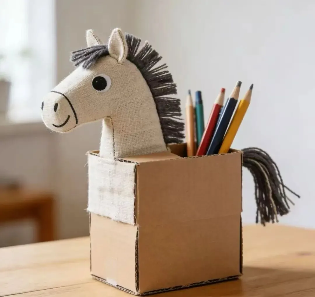 利用家里的废旧物品(纸箱、塑料瓶、旧报纸、旧布料等),制作马年特色手工作品(如小马笔筒、马年收纳盒、剪纸小马、废旧布料小马玩偶等),实现废旧物品再利用。