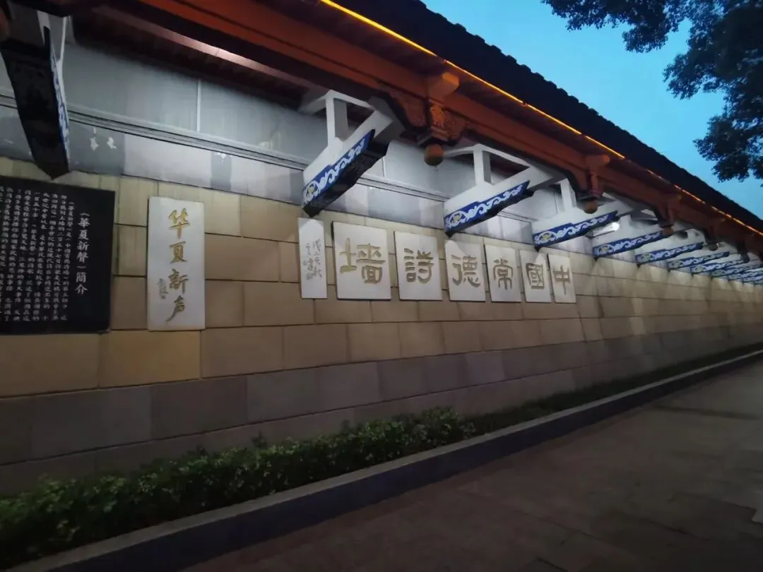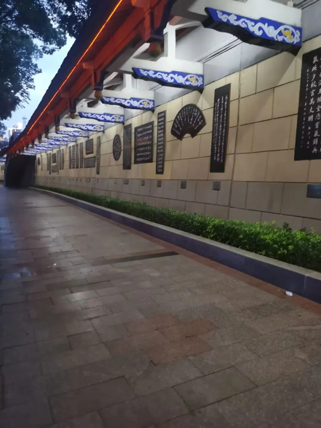 起初是一段开阔的江岸视野,沅江在暮色里泛着沉静的波光,与诗墙上的墨迹遥相呼应。我们沿着墙缓行,目光被一处处书法牵住——有的端庄如山,横竖间自有千钧气度;有的飘逸若云,撇捺里藏着风的行迹。每换一种书体,就像跨进另一重意境:隶书的古拙让人想起青铜礼器,楷书的方正似见旧时书院,行书的流转则像江上舟行。