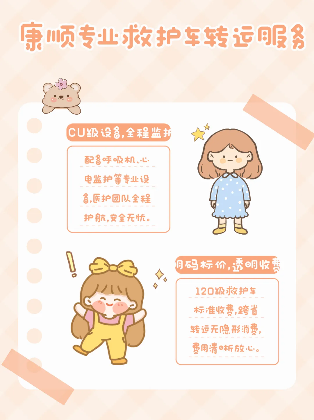您好,我是康顺转运救护车租赁公司,致力于为广大患者提供专业、安全、贴心的非急救医疗护送服务。当您面临术后转院、慢性病治疗或行动不便的出行需求时,我们便是您最信赖的伙伴。我们深知每一次转运都是对生命的守护,因此我们更加注重服务的专业性和人文关怀。