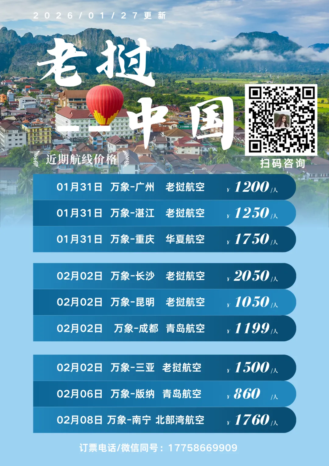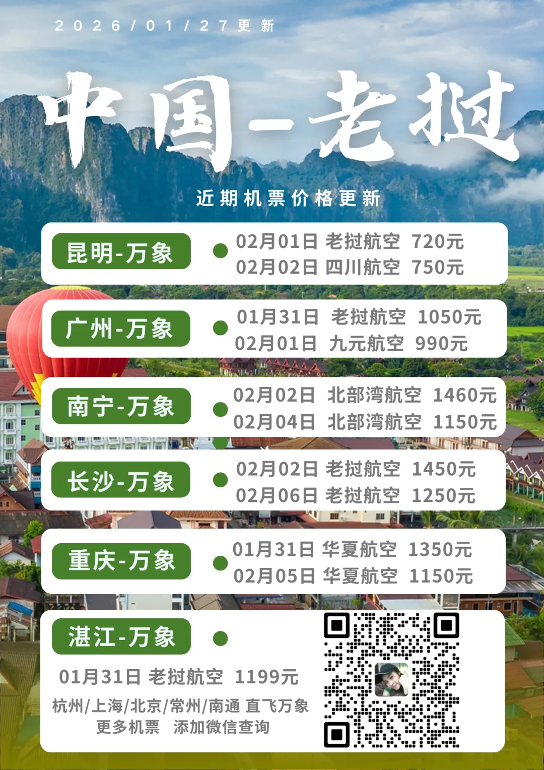 >2月中老特价机票:2日万象-长沙2050元/人;1日昆明-万象720元/人