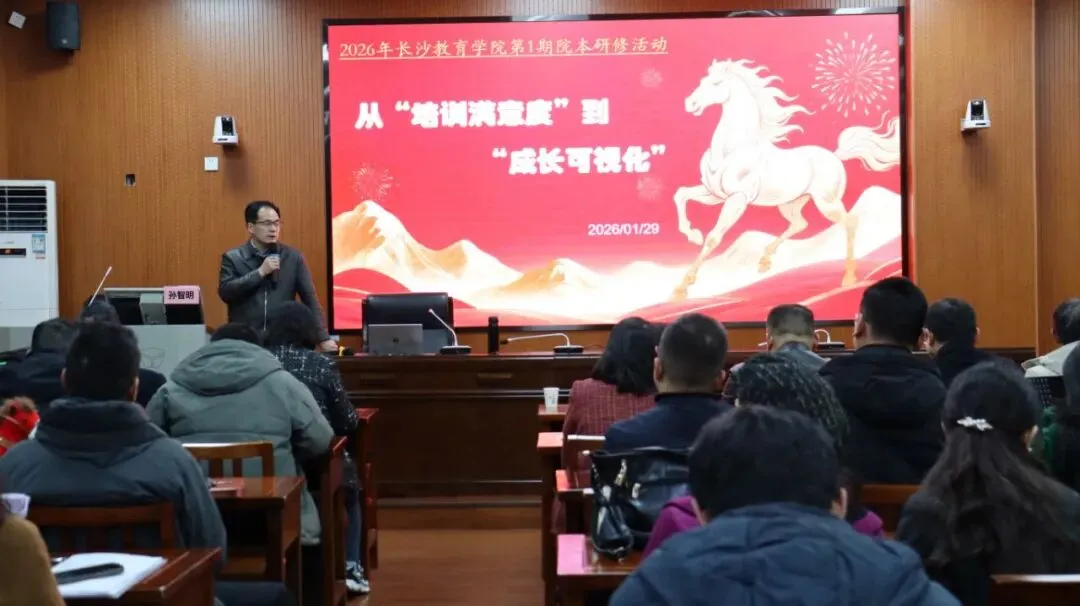 1月29日,长沙教育学院举办2026年第1期院本研修活动暨2025年度培训工作总结研讨会。本次活动以“从‘培训满意度’到‘成长可视化’:迈向科学化、精准化的教师培训评价”为主题,汇聚学院全体教师及各区、县(市)教师发展机构负责人代表,通过主题分享、专家讲座与互动研讨,共同探索教师培训评价转型新路径。