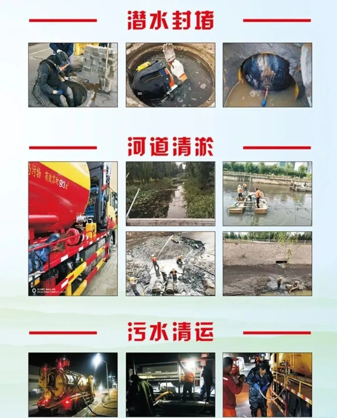 市政管道:市政管道清淤、非开挖管道修复、箱渠清淤、河道清淤、窨井、沟渠清理,以及管道、池塘、河涌、河道淤泥清理