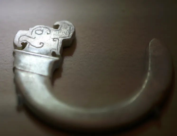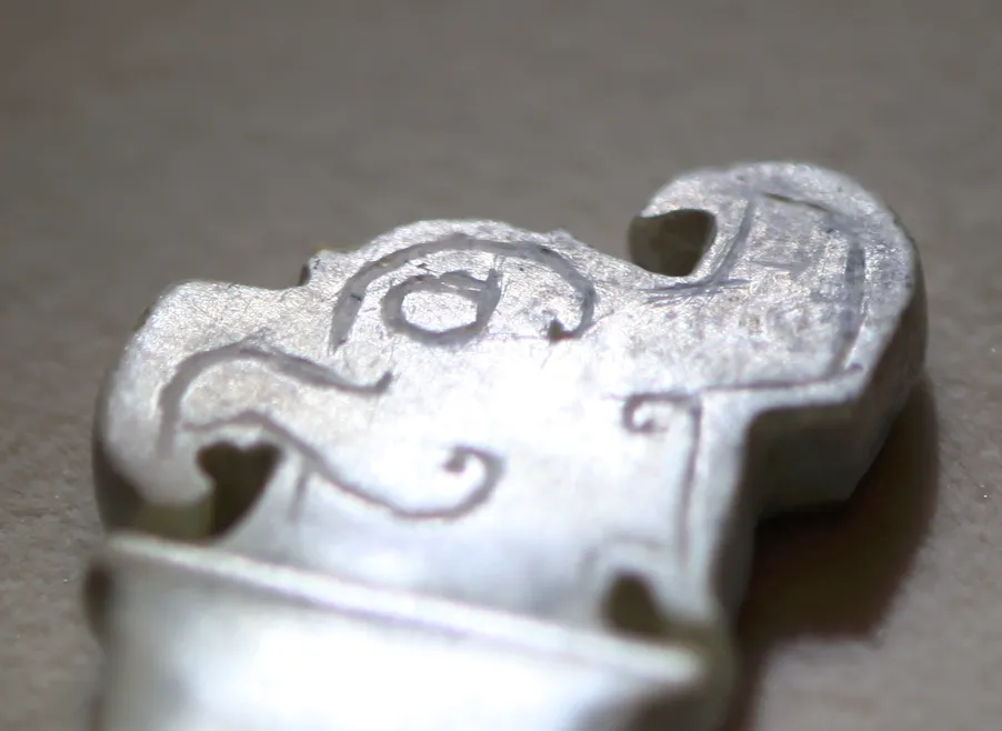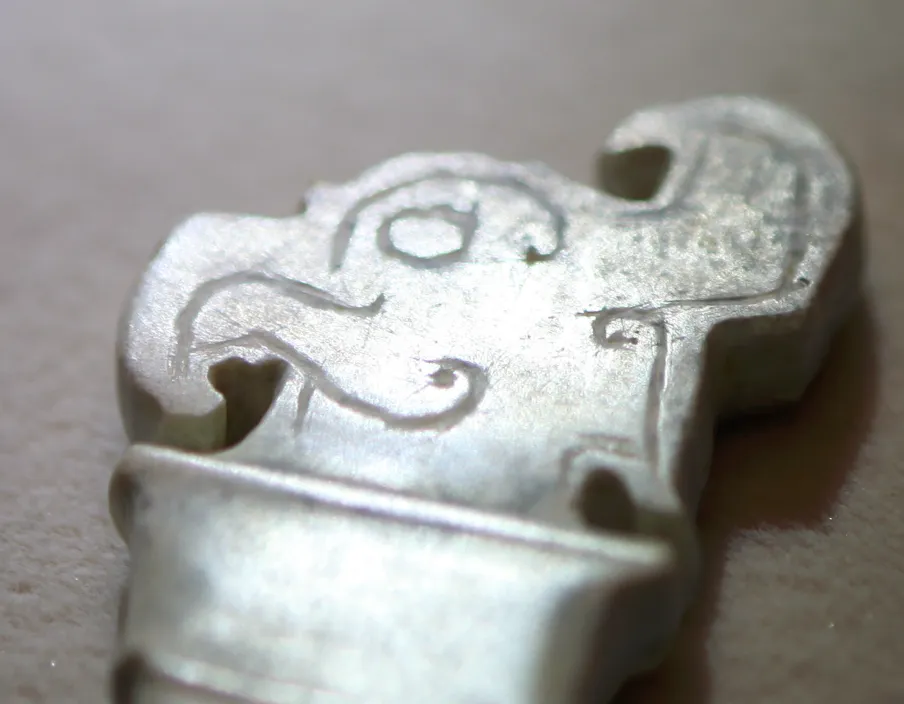 颈部的阴刻线并非龙纹的 “项圈”,而是凤鸟的羽领纹(束颈纹),以平行细阴线勾勒,模拟凤鸟颈部的羽毛束状形态,这是楚式凤首佩的经典装饰手法。