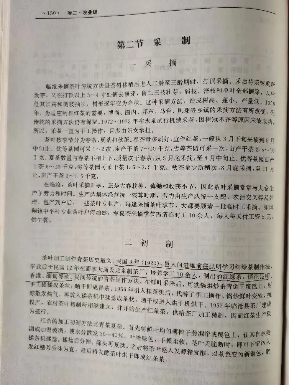 在湖南衡阳人冯绍裘先生1938年来凤庆创制滇红前,云南有没有红茶?确切回答就是有。正史《临沧县志》记载:1920年,临沧“