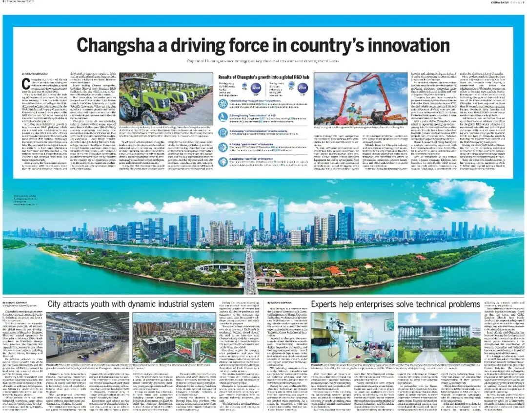 1月27日,中国日报推出跨版专题【岳麓山下 科创潮涌:长沙加快向全球研发中心城市迈进】,讲述长沙锚定全球研发中心城市建设目标,发挥重大科研平台牵引作用,以科技创新赋能现代化产业体系,链接全球创新资源,凭借优良生态打造企业与人才的“强磁场”,让人才活力与城市创新实现深度耦合。