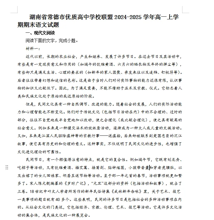 >湖南省常德市优质高中学校联盟2024-2025学年高一上学期期末语文试题