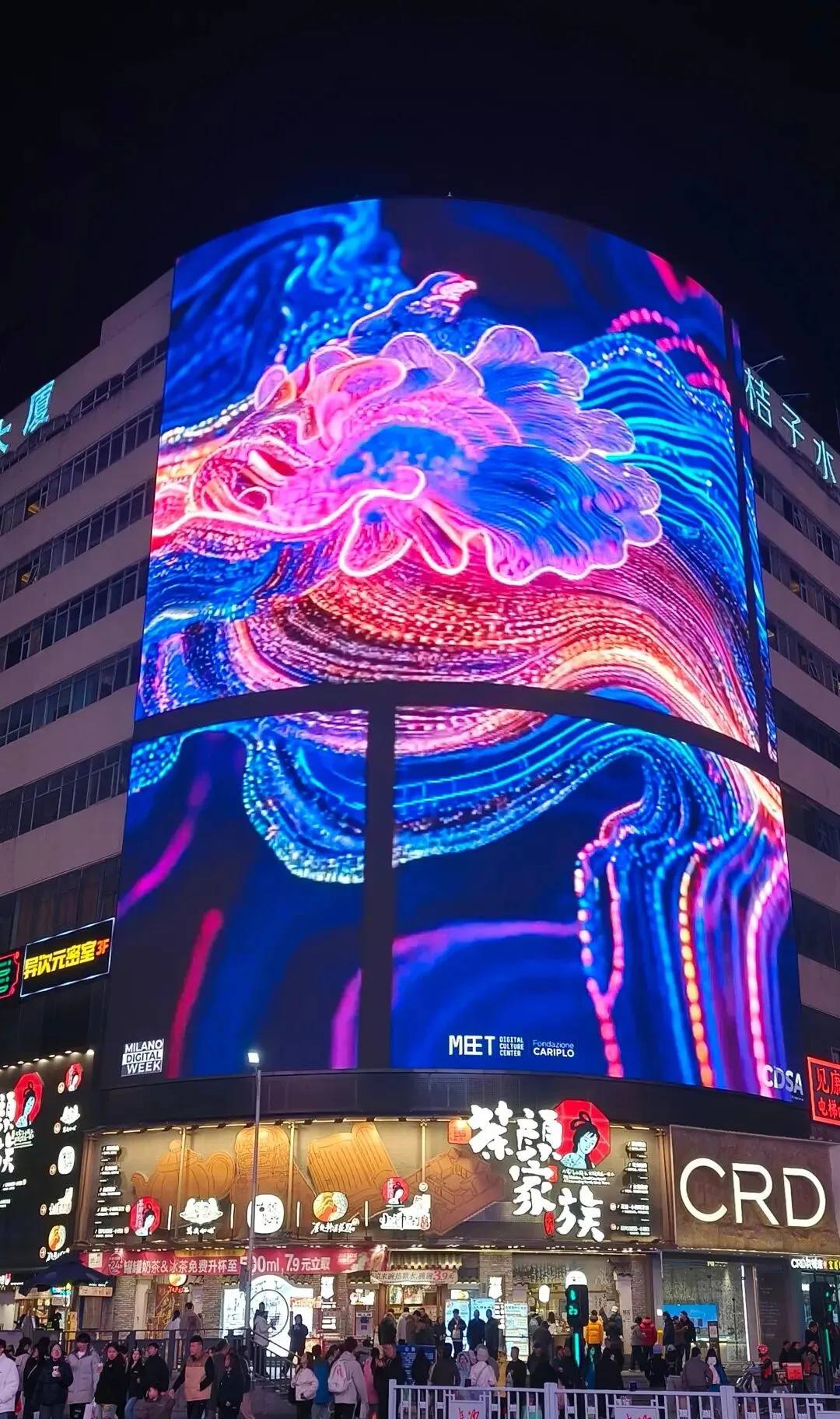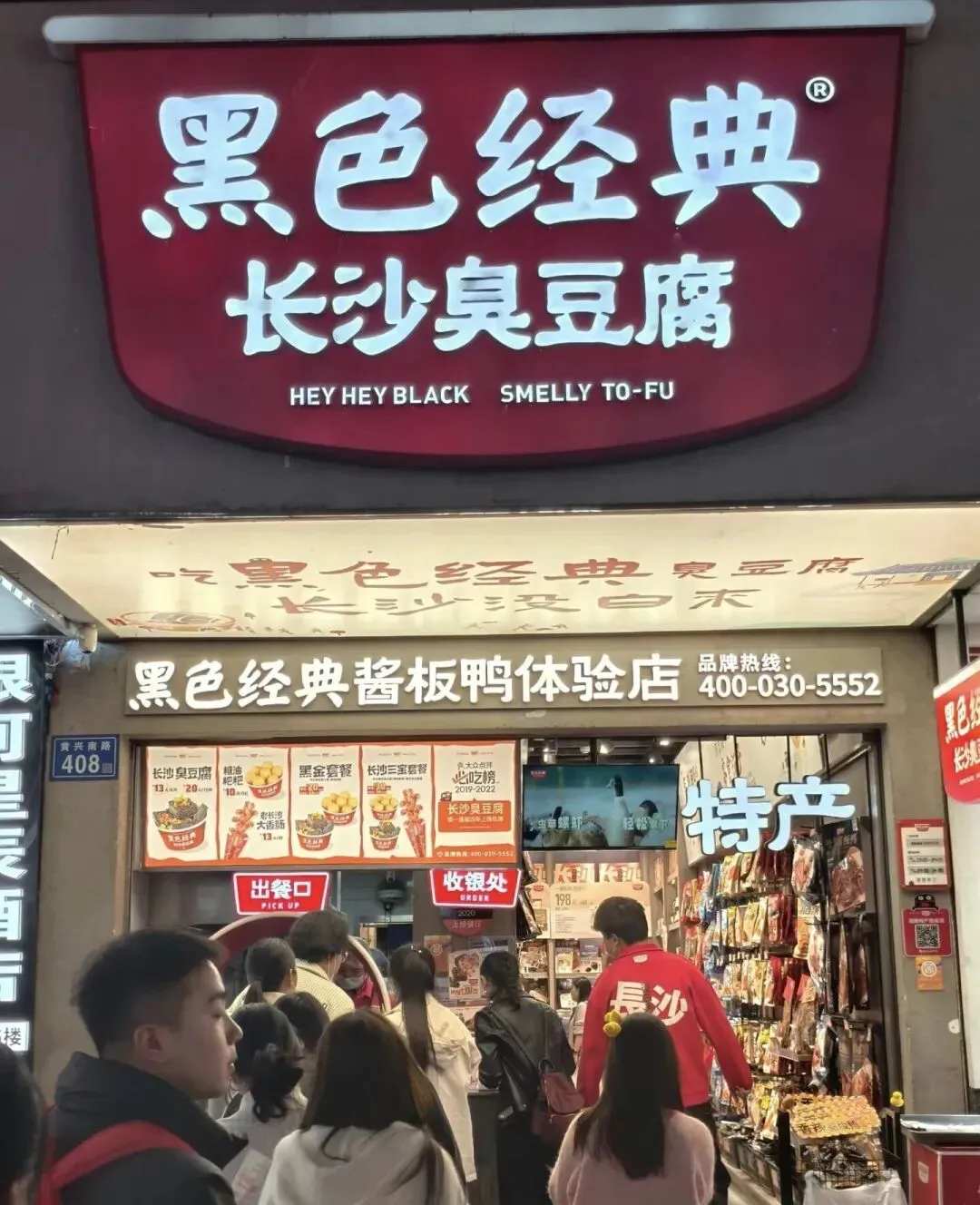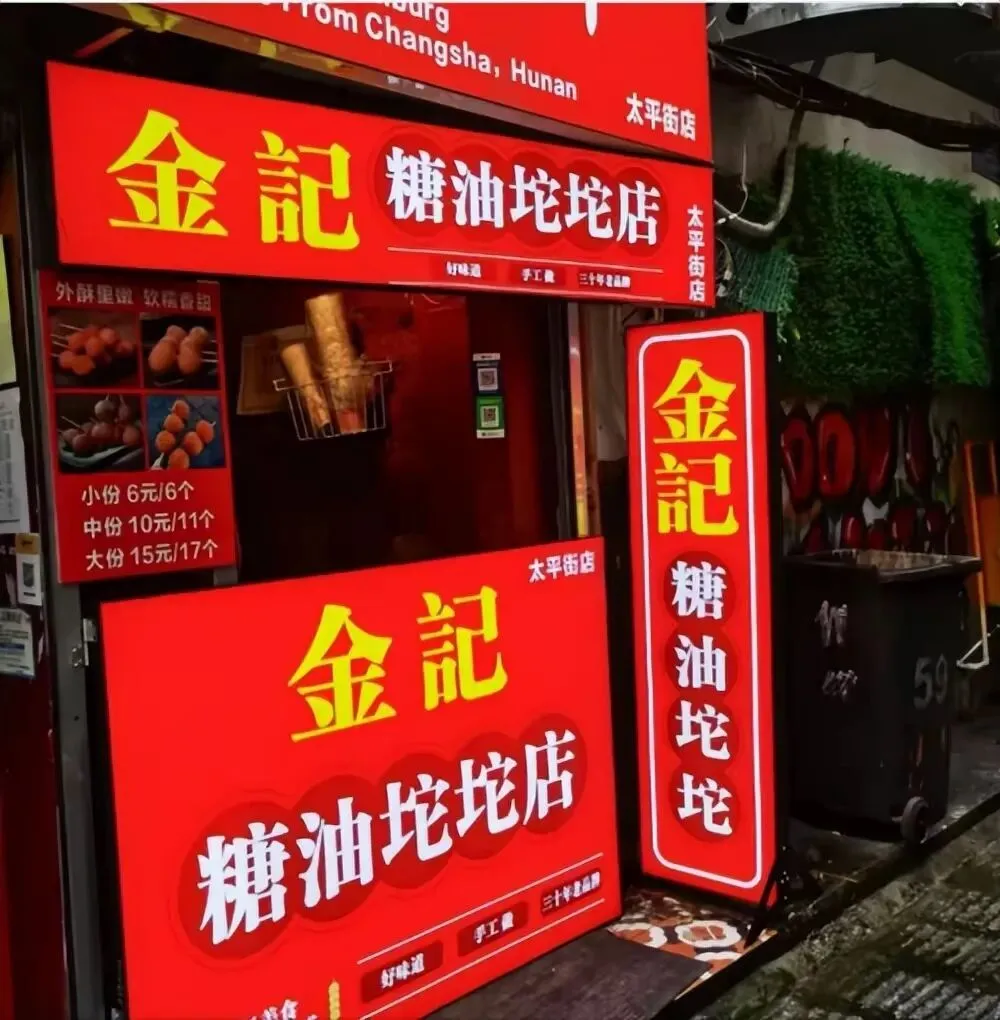 周边的写字楼渐次熄灭办公灯光,取而代之的是商圈里次第亮起的店铺招牌,从赛博朋克风的霓虹灯带 to 温馨雅致的橱窗暖光,将五一广场织成一片灯的海洋,川流不息的人群在此交汇,脚步声、交谈声、叫卖声交织成最鲜活的都市乐章。沿着黄兴步行街向南漫步,霓虹闪烁的街道如一条流动的星河。黑色经典臭豆腐的招牌在夜色中格外醒目,“三叉戟”LOGO下排起长队,油炸豆腐的香气混着蒜蓉与辣酱的滋味,隔着几条街都能勾动味蕾。行人手中几乎都提着各色小吃,糖油粑粑裹着琥珀色的糖汁,外酥里糯,食客们遵循着“三吹三舔”的老规矩,小口品尝这传承千年的甜香。