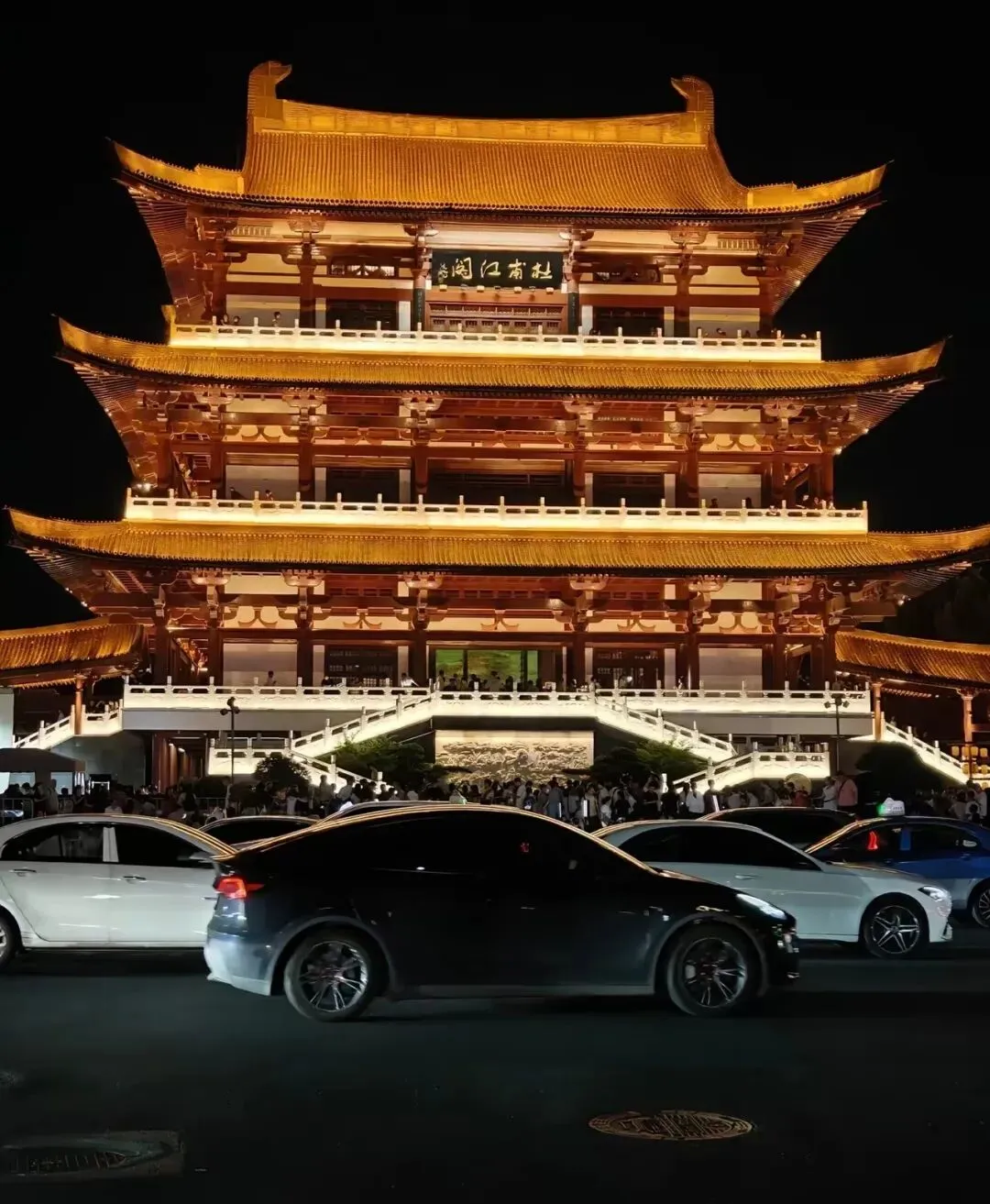 从坡子街出来,湘江岸边的杜甫江阁正披上金色的羽衣。飞檐斗拱在灯光的勾勒下如展翅欲飞的鸾鸟。