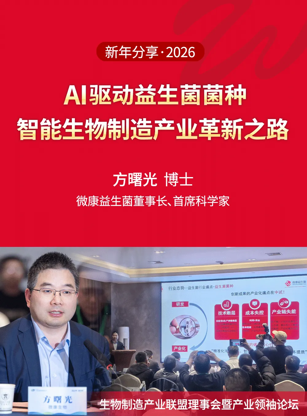 2026 年1月15日,微康益生菌董事长方曙光博士在“生物制造产业联盟理事会暨产业领袖论坛”分享报告并阐述了AI 驱动益生菌 “菌种开发-制造-应用” 全链条智能化升级路径。