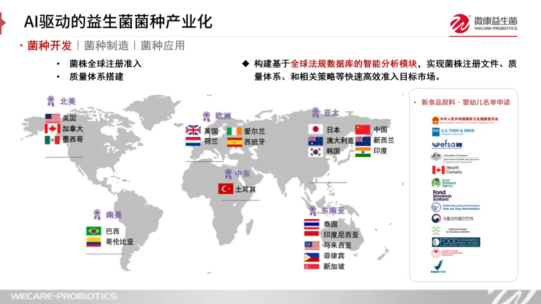 第三点是注册/准入。无论国内还是国际,现在对益生菌菌株的要求越来越严。国内以前更多停留在"到种的水平",现在肯定要到"株的水平"。国外推进更早,除了要到株的水平,很多菌株还要按目标市场的流程去做合规,比如美国市场常见的GRAS路径等。更现实的是,各国流程和要求还在变化:进美国、进欧盟,尤其这几年进入一些新兴市场(例如东南亚),监管往往更细、更严。微康在这方面有自己的积累,因此在品种开发和商业化变现过程中,会同步把注册准入体系导入进来。