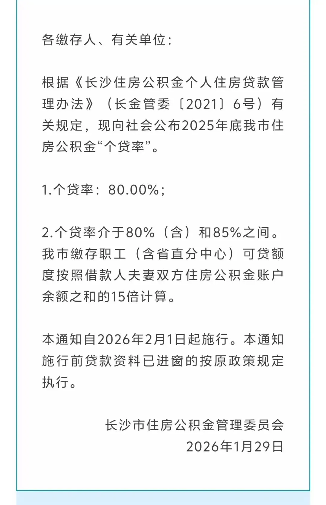 值得注意的是,长沙公积金个贷倍数实行“一年一调”:中心每年1月公布上一年度个贷率及本年度贷款执行的 n倍数 ,并于2月1日起执行。2026年的n倍数将根据最新个贷率确定,直接影响贷款额度计算。
