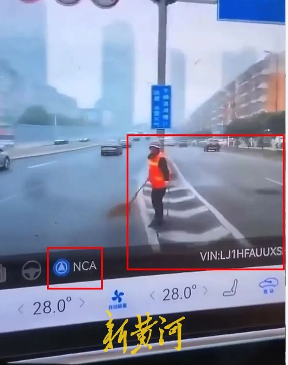 记者从涉事车辆行车记录视频中看到,车辆仪表盘显示其全程处于“NCA”(智驾领航辅助)开启状态。在视频最后一秒,系统由NCA状态切换至AEB(自动紧急制动)状态。
