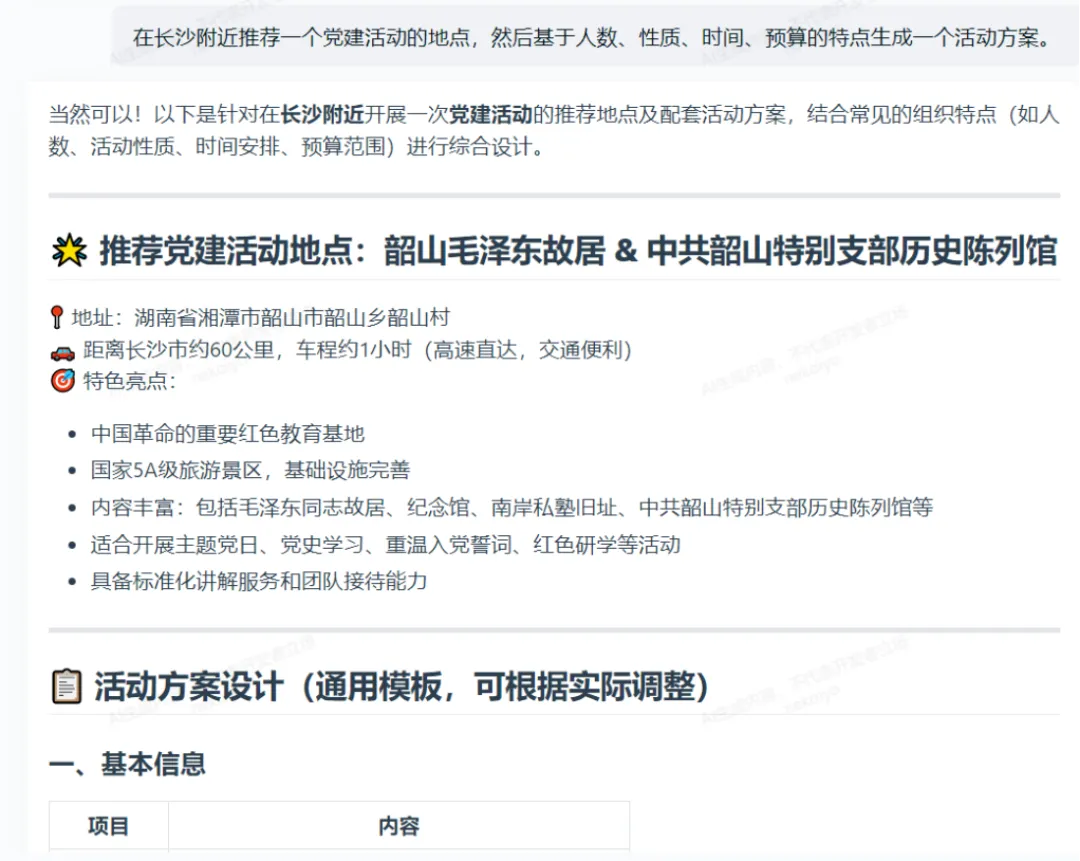 在服务模式创新上,通过九天大模型平台推出 “三维定制化服务”,适配不同的主题及党员的个性化需求,通过场景化案例打造不同的主题党日方案,协助完成党建组织方案、日程提醒等,为支部党建活动推荐活动地点,生成活动方案,并在相关活动活动里标明关于活动场地的开放时间、开放要求等重要注意事项。