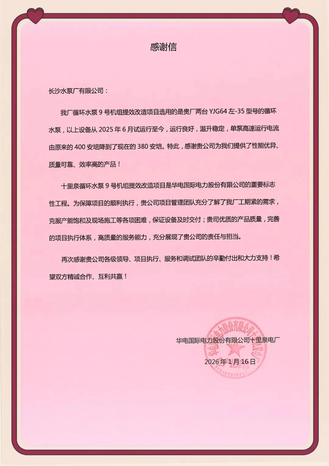 近日,华电国际电力股份有限公司旗下十里泉电厂正式向长沙水泵厂有限公司发来感谢信,对其在 “循环水泵 9 号机组提效改造项目”中提供的高品质定制化产品、全流程闭环式高效服务给予高度认可与诚挚致谢。作为华电国际能源保供与绿色转型的标志性工程,该项目自2025年6月投入试运行以来,设备运行持续平稳、性能表现远超预期,成功实现显著节能增效,为电力行业老旧机组提质改造树立了可复制、可推广的优质典范。