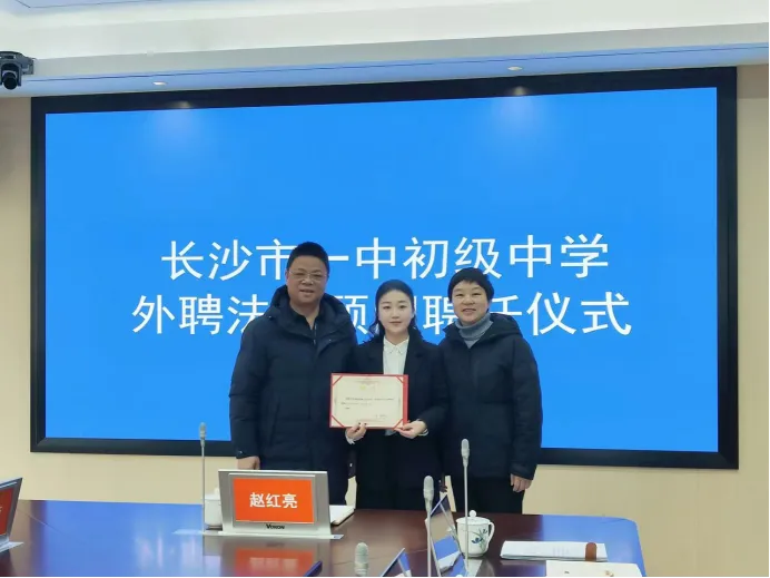 (长沙市一中初级中学校长为孙雅茜律师颁发聘书)